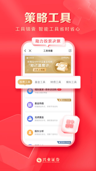 「兴业证券优理宝」是兴业证券精心打造的股票开户交易,基金投资理财平台。发挥兴证集团优质的投研投顾能力,优理宝提供丰富的交易品种和智能化投资工具,推出选股、诊股、盯盘、交易、分析等一系列功能,为客户打造全方位、个性化、特色化的内容服务,是值得投资者信赖的券商APP! 【新客专属最高8.XX%理财】 新客户通过兴业证券优理宝APP开立证券账户,可购买约定年化收益率8.XX%新客专享理财——单客限购额度5万元,额度有限,期限14天。 开户成功后,可在优理宝APP首页十宫格-新客理财页面中购买,限在开户成功后的下月月末前购买一次,本活动自2022年8月1日起长期有效。 【荣誉奖项】 1)2022年中国证券业十大品牌APP“君鼎奖” 2)2022年金融界领航中国“金智奖”——“杰出十佳APP奖”、“杰出投资者教育奖”、“杰出金融科技” 【特色服务】 1、智能盯盘——六大盯盘策略,覆盖股票、指数、基金、债券等各类资产标的。 2、智能选股——形态、主题、条件、策略,多维度选股更专业。 3、智能交易——直接参与LOF、可转债等多品种套利策略。 4、筹码分布——分析主力建仓成本,辅助投资决策。 5、智能资讯——个性化推荐热点资讯,助你把握投资机会。 6、智能助手——7*24小时温馨陪伴,体验全天候响应专业服务。 7、投顾广场——金牌投顾,专业服务,优质内容。 8、兴证研报——“新财富”分析师团队深度解析市场行情。 9、今日解盘——盘前、盘中、盘后,每日分析大盘走势。 10、今日机会——助力捕捉市场热点,洞察投资机会。 【联系方式】 有任何问题,欢迎和我们联系: 1、打开兴业证券优理宝,点击“我的客服”。 2、拨打服务热线:95562,人工服务时间为交易日8:30-18:00。 *投资有风险,入市需谨慎