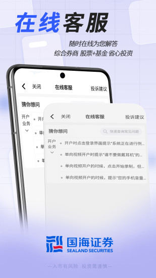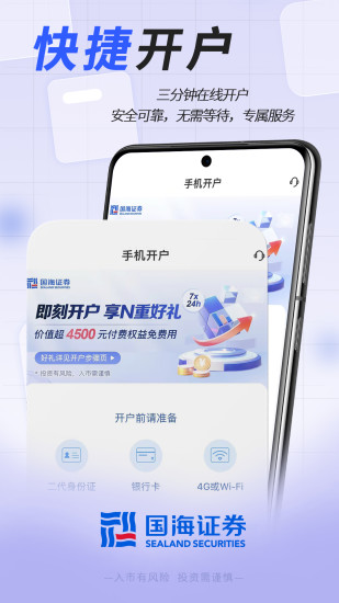国海证券开户APP是国海证券精心为客户打造的开户系统,支持投资者7x24小时线上开户服务,备好身份证和银行卡,轻松完成开户。开户就是这么简单! 【特色功能】 1、安 全:严格保护用户个人信息安全。 2、迅 速:采用单向视频专项技术,几分钟随时随地掌上开户,省时省力。 3、服 务:全国客户均享优惠佣金费率,无入金门槛,帮您节省更多的手续费。 4、便 捷:支持全国18家主流银行三方存管,绑卡一步到位! 【开户准备】 1、手 机:请确保摄像头和扬声器功能正常。 2、网 络:建议在WIFI或3G/4G/5G网络下进行开户。 3、身份证:请准备本人二代居民身份证。 4、银行卡:请使用本人同名借记卡(不可绑定信用卡)。 【联系我们】 如您在股票投资、软件使用过程中,有任何问题,欢迎您联系我们! 客服热线:(0771)95563 公司官网:http://www.ghzq.com.cn/ 电子邮箱:dshbgs@ghzq.com.cn