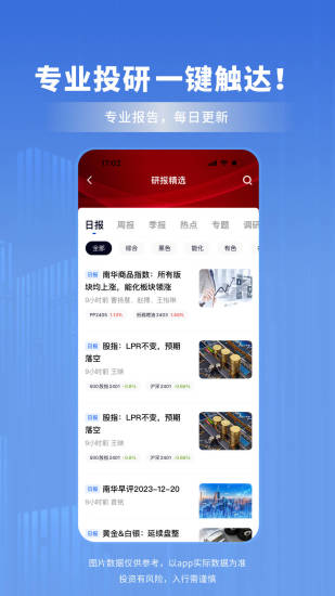 南华期货app是一款专业、安全、可靠的期货投资交易软件,为用户提供线上期货开户、期货行情以及投资研报、新手课堂等一系列综合金融服务。 【特色功能】 1.期货开户:手机APP自助开户,开户无费用,快速、便捷; 2.期货交易:双交易系统快速稳定,且提供多种指标工具助力交易; 3.期货行情:实时行情,辅助指标南华指数深度分析行情数据,持仓龙虎榜及库存仓单洞察品种交易趋势; 4.期货资讯:专业期货研报及期货策略,多维度数据分析,实时行情快讯,助力投资; 5.期货课堂:精选优质课程推荐,免费学习期货期权基础知识,期货大咖讲师助您快速入门; 6.一键模拟:百万模拟体验金,帮助期货入门,检验期货策略。 【公司简介】 南华期货是国内主板上市期货公司(股票代码:603093 ),为投资者提供一站式财富增值平台。南华期货APP为投资者提供全方位期货行情、线上期货交易、手机在线开户等服务,是一款专业的期货交易软件。 联系方式: 如果您在APP使用过程中,有任何建议或者问题,可以联系我们。 服务热线:4008888910 公司官网:http://www.nanhua.net/ 投资有风险,入市需谨慎!