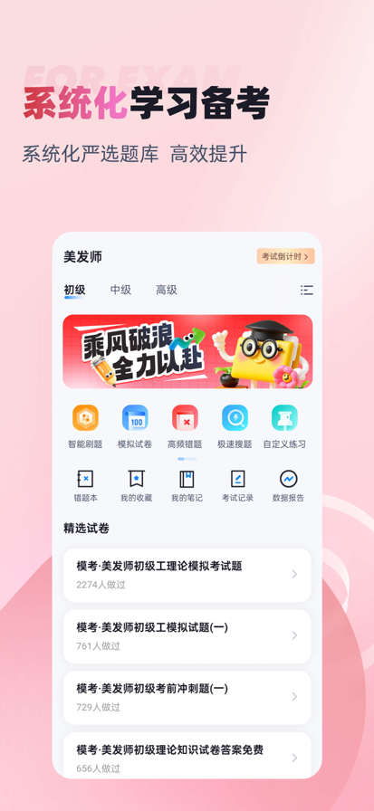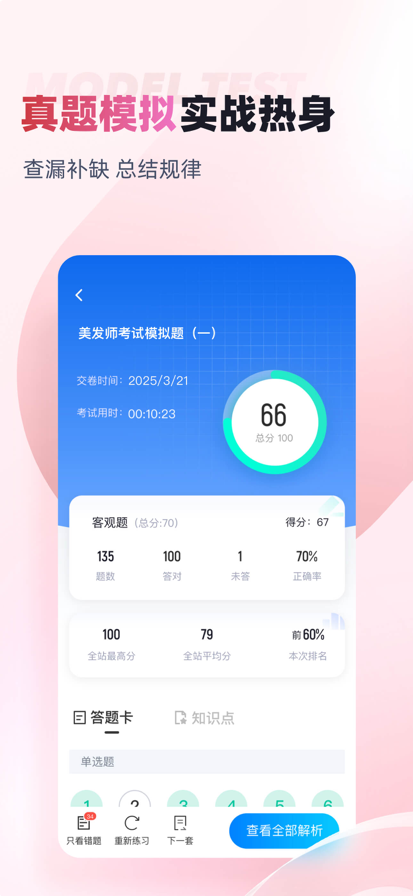 美发师考试聚题库——专业备考 精准训练 助力美发技能认证 备战美发师职业资格考试?美发师考试聚题库是您专业可靠的备考助手。我们提供权威精准的练习资源,助您系统掌握美发专业知识与操作技能,从容应对考试挑战。 真题模拟实战演练 应用内精选汇集历年考试真题及高质量模拟试卷,严格依据最新考试大纲与职业技能标准精心编写。通过模拟考试功能,您可体验真实考场环境,进行全真限时测试。考试结束后,系统即时生成详细分析报告,清晰展示您在发型设计、剪发技术、染烫工艺、设备使用等各模块的掌握情况。智能评估系统精准定位知识薄弱环节,帮助您明确复习重点和改进方向。 系统化知识点练习 我们依据考试要求将知识点科学分类,涵盖发型设计原理、剪发技术要领、染发色彩学、烫发化学原理、头皮护理知识、工具设备使用、卫生消毒规范、服务礼仪等核心内容。每个知识点模块都配有专项练习题和详细解析,帮助您深入理解美发专业知识。您可以根据学习进度选择对应章节练习,巩固理论基础,掌握重点难点。 美发师考试聚题库集权威真题模拟与系统知识点练习于一体,设计科学,操作便捷。通过反复的实战演练和针对性训练,帮助您夯实专业基础,提升实操技能水平。应用内容持续更新,紧跟行业技术标准和考试要求,是您备考复习、查漏补缺、提升通过率的专业工具。立即下载应用,开启高效备考之旅,为美发师职业发展奠定坚实基础。