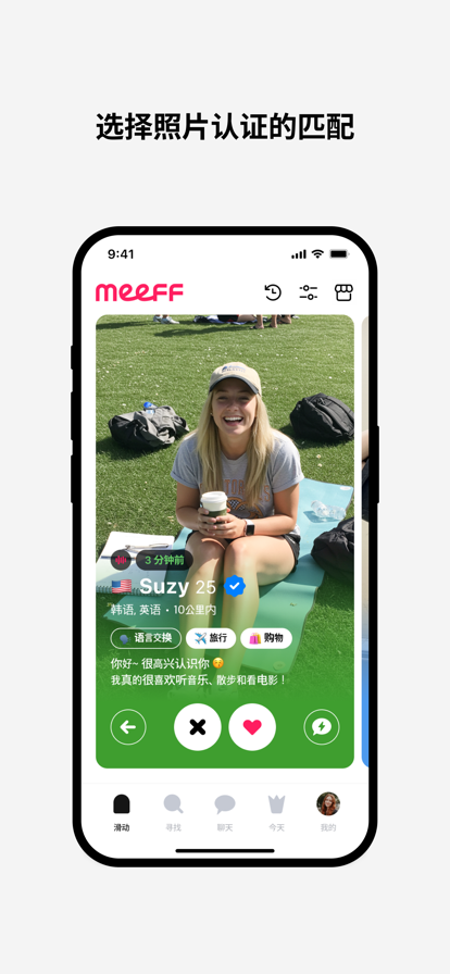 在聊天、匹配、约会、语言交换应用MEEFF上可以进行聊天。 想认识韩国朋友、法国朋友、美国朋友等聊天朋友吗?还是想通过聊韩国电影、韩剧、中国电视剧、外国文化,用韩语、日语、法语、英语进行语言交换,结交聊天朋友呢? 这不仅仅是一个简单的语言交换应用,而是一个能够交流爱与友谊语言的最佳语言交换应用。 MEEFF提供免费匹配、免费聊天、免费入场等多种免费功能,让你可以通过这些功能结识新朋友! ■ 觉得文字沟通不够?快来和朋友视频通话 通过 VibeMeet 或 1:1 聊天,你可以随时与心仪的朋友通话。在 1:1 聊天中,视频通话不限次数。面对面交流能传递更深层的情感与温度。微笑与眼神的互动将让你们的心贴得更近。 ■ 照片认证 通过“安全个人资料认证”向大家展示真实的你!比起百句自我介绍,一个认证徽章更能让你魅力倍增。放心结识那些经过认证、值得信赖的朋友吧。 ■ 灵活设置多种筛选条件 寻找你想要的邂逅——搜索附近的、当前在线的或特定国家的朋友。通过自定义筛选功能,遇见全世界的朋友。 ■ 365天举报监控 MEEFF通过诈骗举报系统,持续监控虚假资料和可疑活动。 如果遇到不当用户,请立即举报。 我们致力于打造一个安全、让人放心的MEEFF。 你可以叫我任何名字:meeff,mef,都可以! 今、地元の友達ではなく外国の友達に会いたいですか? 196か国の友達がいるMEEFFに来てください! ========== ※ 访问权限信息 [所需访问权限] - 位置:查看客户位置以查找附近的朋友 - 摄像头:视频通话或上传个人资料照片时所需 - 麦克风:视频通话时所需 -- 我们为需要增强功能的用户提供付费订阅项目。 ■ 基础订阅 (Basic):无限发现! - 去除应用内所有广告 - 无限次点赞 - 每日赠送红宝石 (每日签到时 5 个) - 每日赠送“查看访客”道具 (每日签到时 2 个) - 提供 VIP 个人资料框 ■ 尊享订阅 (Plus):仅限认证朋友!为你量身定制的无限匹配 - 可设置最多 5 个目标国家的筛选器 - 5km 范围内的附近朋友筛选器 - 仅查看照片认证朋友的筛选器 - 按个人资料照片数量筛选朋友 - 筛选当前在线的朋友 - 可设置最多 5 个排除国家的筛选器 - 按使用目的筛选朋友 - 包含基础订阅的所有权益(无广告、无限点赞) - 每日赠送红宝石 (每日签到时 10 个) - 每日赠送“查看访客”道具 (每日签到时 5 个) 本产品为自动付款订阅方式。 除非您在当前期限结束前至少 24 小时取消,否则将收取续订费用。 订阅付款将通过您的 iTunes 帐户自动进行,您可以随时在帐户设置中取消订阅付款。 如果用户购买订阅,任何未使用的免费试用期将被没收。 -- 本服务包括付费应用内项目,购买需单独付费。 - 使用条款:https://bit.ly/meeff_tos - 隐私政策:https://bit.ly/meeff_privacypolicy - 基于位置的服务条款和条件:https://bit.ly/meeff_location 开发者联系信息: MEEFF_ADMIN@adxcorp.kr / 070-5038-6396 地址:首尔市江南区彦州路 508 号首尔常绿厅 11 楼