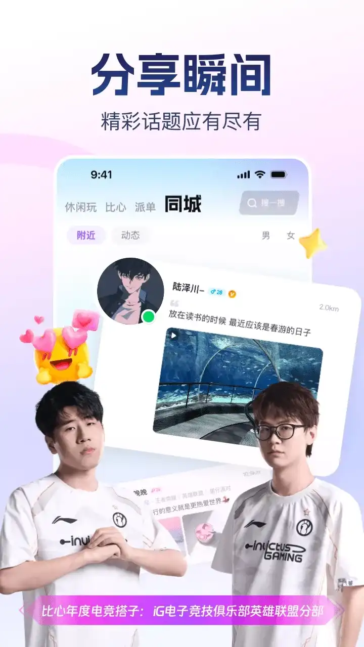 找游戏陪练,上比心APP就够了! 【主流&热门新游戏陪练】 比心APP拥有众多主流及热门新游戏陪练,一键找到好听的声音,有趣有技术的大神,带你默契上分!找英雄联盟、王者荣耀、和平精英、永劫无间、绝地求生、元梦之星、蛋仔派对、金铲铲、CS:GO游戏陪练,上比心就够了! 【明星战队官方指定游戏陪练平台】比心现已同iG电子竞技俱乐部英雄联盟分部组成“年度电竞搭子”。上比心同iG.TheShy等各大战队明星选手一起开黑,多个战队官方青训招募带你晋升职业赛场,还有战队空降语音直播、明星水友赛,与职业选手0距离互动! 【800万电竞大神,找人就是快!】 比心拥有800万电竞大神,是6000万游戏玩家的选择,绝活哥、退役职业选手、声音好听情商在线的优选大神、大佬俱乐部、包赢车队应有尽有,各类游戏陪练带你稳稳上分,解锁满分游戏体验,一起开黑不孤单! 【明星战队入驻比心】 英雄联盟2023季中冠军赛亚军:BLG 英雄联盟S9世界冠军:FPX 王者荣耀2022世冠冠军:武汉eStarPro