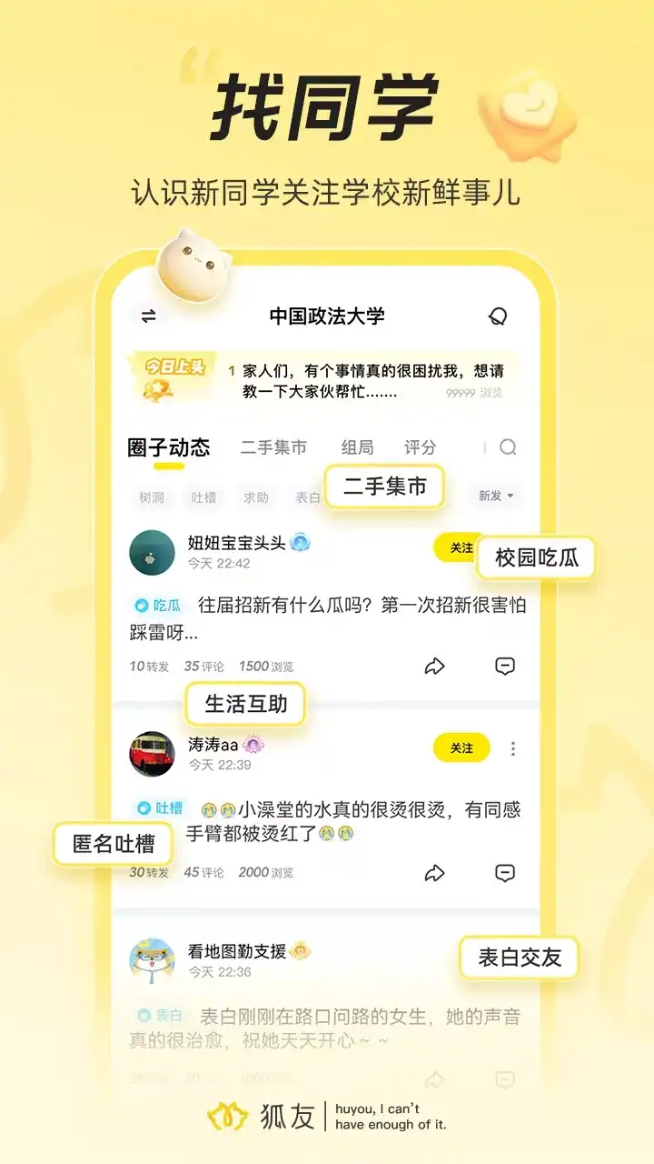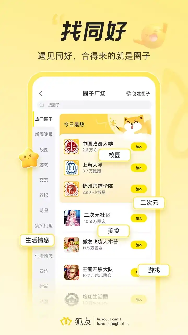 狐友一款搜狐打造的社交APP,这里有值得关注的人,懂你的AI,这里是有温度的社交乐园,多关注,多说两句转发,你的每一个字都会有回音。 在狐友,你可以: 【校园】全校级朋友圈 认识有趣新同学,发现学校新鲜事,覆盖学习、求助、吐槽、二手、社团等多个生活场景,加入你的学校圈子,一起记录珍贵的校园时光。 【圈子】汇聚同好狐友 恶趣搞笑、情感分享、兴趣领域、明星八卦...加入感兴趣的圈子,遇见与你一样特别的人。 【关注】这些狐友真有趣 吃货属性、内向星人、二次元爱好者,一键关注狐友为你推荐的好友,用聊天打败孤独。 【互动】开启今日份嗨聊 搞怪网友日常、娱乐明星趣事、吃喝玩乐安利,校园趣事新闻,勇敢说两句转发,今日快乐已被承包。 【分享】心情说给狐友听 “今日份的自拍来了”、“失眠到深夜”、 “这一刻我酸了”,发布动态,分享你的人生点滴,和狐友一起碎碎念。 【动态】发现有趣有才的狐友 探店达人、神级Coser、灵魂画手、健身大神,点击“动态”tab,随时找到你感兴趣的人。 【标签】标记每时每刻 记录情绪、标记兴趣、地点打卡,添加个性标签,有趣内容、合拍好友轻松get。 【分享链接】专属有料收藏夹 这是专属于收集达人的实用功能,干货文章、搞笑段子、精彩短视频,复制链接发布到狐友,让狐友做你的贴心收藏夹。 「狐友」致力于为用户提供更好的服务和体验,使用过程中如遇任何疑问或建议,欢迎联系我们: 1、使用狐友私信功能联系@狐友客服 2、打开狐友,点击我-设置-意见反馈 3、微信公众号:狐友 4、新浪微博:@狐友 5、客服邮箱:huyoufeedback@sohu-inc.com