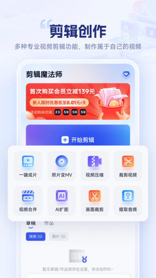 剪辑魔法师是一款简单易用的视频编辑工具,集视频剪辑、合并和压缩等功能于一身。这款应用的推出,将让你轻松驾驭视频编辑工作,迅速提升你的创作效率。 产品主要功能: 1.视频剪辑 简单易用:无需复杂的操作,只需选择你要剪辑的视频,然后使用我们的智能剪辑功能,即可轻松完成视频切割。 2.视频合并 合并多种格式:支持多种格式的视频文件合并,无论是MP4、AVI还是其他格式,都能轻松应对。 3.视频压缩 智能压缩:采用先进的压缩算法,在保证视频质量的同时,大幅度地减小文件大小 4.视频编辑 支持视频变速、抠像、拼贴、倒放、变音、调色、加滤镜、加特效以及涂鸦等操作 5.图片编辑 支持图片拼贴、人像抠图、物品抠图、宫格切图、横向拼图、纵向拼图、长截图、图片加滤镜等操作 6.AI扩图 通过智能AI功能,一键扩大图片范围 7.实用小工具 支持画面裁剪、修改MD5、添加字幕、书单制作、视频变漫画、视频配音、文字视频、提词器、消除笔、格式转换等 8.特色小工具 支持对口型、GIF制作、添加水印、照片变3D、照片动起来、画中画、修改封面、制作二维码等 如有任何问题或建议,请随时联系我们