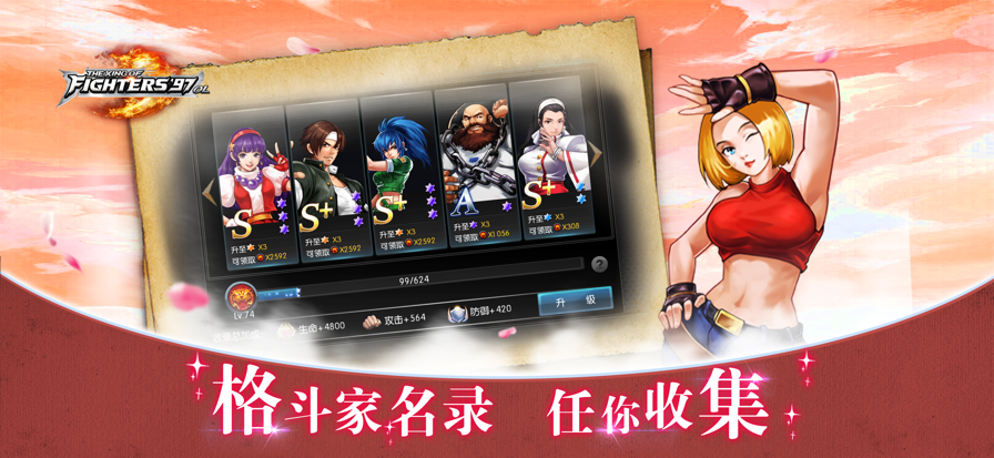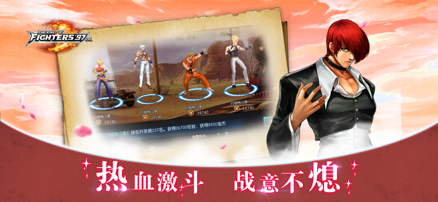 一、游戏介绍 《拳皇97 OL》由日本SNK正版授权,并全程参与监修。超高度还原“拳皇”系列精髓,数十位拳皇角色轮番登场,唤醒童年热血情怀;多套技能组合开启感官新世界,为玩家带来激爽格斗体验;合理的预判与走位、精准的技能释放、惊艳的技能组合,呈现真实打的击感,实现你连击爆表的超神之梦;游戏采用自主研发的Valhalla引擎,强大的双引擎技术实现高清4K级画质,带来电影级视听享受;组队闯关、实时竞技,阵营PK、世界BOSS争夺,跨服挑战各区精英高手,与社团兄弟并肩作战,在这里感受一个属于拳皇的世界! 二、游戏特色 ---SNK正版授权,经典100%还原--- 游戏由日本SNK正版授权,并全程参与监修,高度还原“拳皇”系列精髓。数十位拳皇角色轮番登场,人物、招式、音效全部还原《拳皇97》,唤醒童年热血情怀! ---真拳皇格斗模式,3V3接力对决--- 老拳皇的对决模式,玩家与玩家之间的实时格斗对战,每人操控3名角色接力上阵! ---极简轻松操作,连招一气呵成--- 拳拳到肉的爽快打击、真实的动作表现、不再有繁琐的出招表,菜鸟玩家也可以轻松打出帅气连招!所有招式高度还原,酷炫必杀炫翻全场! ---原作角色轮番登场,组建全明星格斗战队--- 原作当中的数十位角色将轮番登场,在游戏中可以选择并操作不同的格斗家进行战斗,每一名格斗家都是一种全新的格斗体验! ---4K超清画质,电影级游戏画面--- 游戏采用自主研发的Valhalla引擎,强大的双引擎技术实现4K级画质,全息粒子特效全方面提升了游戏的战斗打击感、光影效果、骨骼动画、物理运动及渲染效果,带来电影级视听享受! 《拳皇97 OL》真拳皇·真格斗!Ready?Go!
