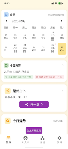 欢迎使用易学宝典,这是一款融合中国传统文化与现代技术的综合性应用。我们的目标是为用户提供便捷、准确的算卦服务,同时帮助用户更好地了解和学习《易经》及其相关知识。以下是易学宝典的详细功能介绍:<br><br>1. 算卦和解卦<br>大衍卦法:大衍卦法是《易经》中描述的一种占卜方法,利用五十根筹策(实际使用四十九根)进行复杂的操作,最终得出卦象。我们在应用中详细还原了这一过程,让用户亲身体验古老的占卜方式。<br>三才卦法:三才卦法是古代常用的占卜方式之一。通过天、地、人三才来解析卦象,提供详尽的解卦结果,帮助用户理解卦象背后的含义。<br>AI解卦:结合现代人工智能技术,AI助手能够快速准确地解读卦象。用户只需输入占卜结果,AI助手便会根据《易经》的理论提供详细的解卦分析,方便用户理解和应用。<br><br>2. AI助手<br>智能问答:AI助手可以回答用户关于《易经》、风水、黄历等方面的问题,提供即时的咨询服务。<br>学习指导:AI助手根据用户的学习进度,提供个性化的学习建议和资源推荐,帮助用户系统地学习《易经》及其相关知识。<br>互动解答:用户可以与AI助手进行互动,通过问答形式加深对《易经》和卦象的理解。<br><br>3. 日历<br>万年历:提供详尽的日历功能,包括公历和农历日期对照,方便用户随时查看。<br>节气与节日:详细列出每年的节气和传统节日,并提供相关的文化知识介绍,让用户更好地了解中国传统节日的由来和习俗。<br>纪念日提醒:用户可以自定义重要纪念日,应用将提供及时的提醒功能,不再错过每一个重要的日子。<br><br>4. 黄历<br>每日宜忌:根据传统黄历提供每日的宜忌信息,帮助用户选择适合的日子进行重要活动,如结婚、搬家、开业等。<br>时辰吉凶:提供每日各个时辰的吉凶信息,帮助用户选择吉时进行重要事项。<br>风水与运势:结合当日的黄历信息,提供简要的风水和运势指导,帮助用户趋吉避凶。<br><br>5. 学习周易六十四卦<br>理论知识:提供详尽的《易经》六十四卦理论知识,包括每一卦的卦辞、爻辞、解读和应用。<br><br>6. 特色与优势<br>传统与现代结合:易学宝典不仅保留了传统的占卜和黄历功能,还融入了现代的AI技术,使应用更具智能化和人性化。<br>全面的功能:集算卦、日历、黄历、学习于一体,满足用户多样化的需求。<br>用户友好的设计:界面简洁,操作便捷,适合各个年龄段的用户使用。<br>使用场景<br>日常生活:随时查看黄历宜忌信息,选择吉日进行重要活动。<br>学习研究:系统学习《易经》知识,了解中国传统文化的智慧。<br>占卜预测:使用三才卦法和大衍卦法进行占卜,获取详尽的解卦分析。<br>互动问答:与AI助手互动,解答日常生活中的疑问,获取专业的咨询建议。