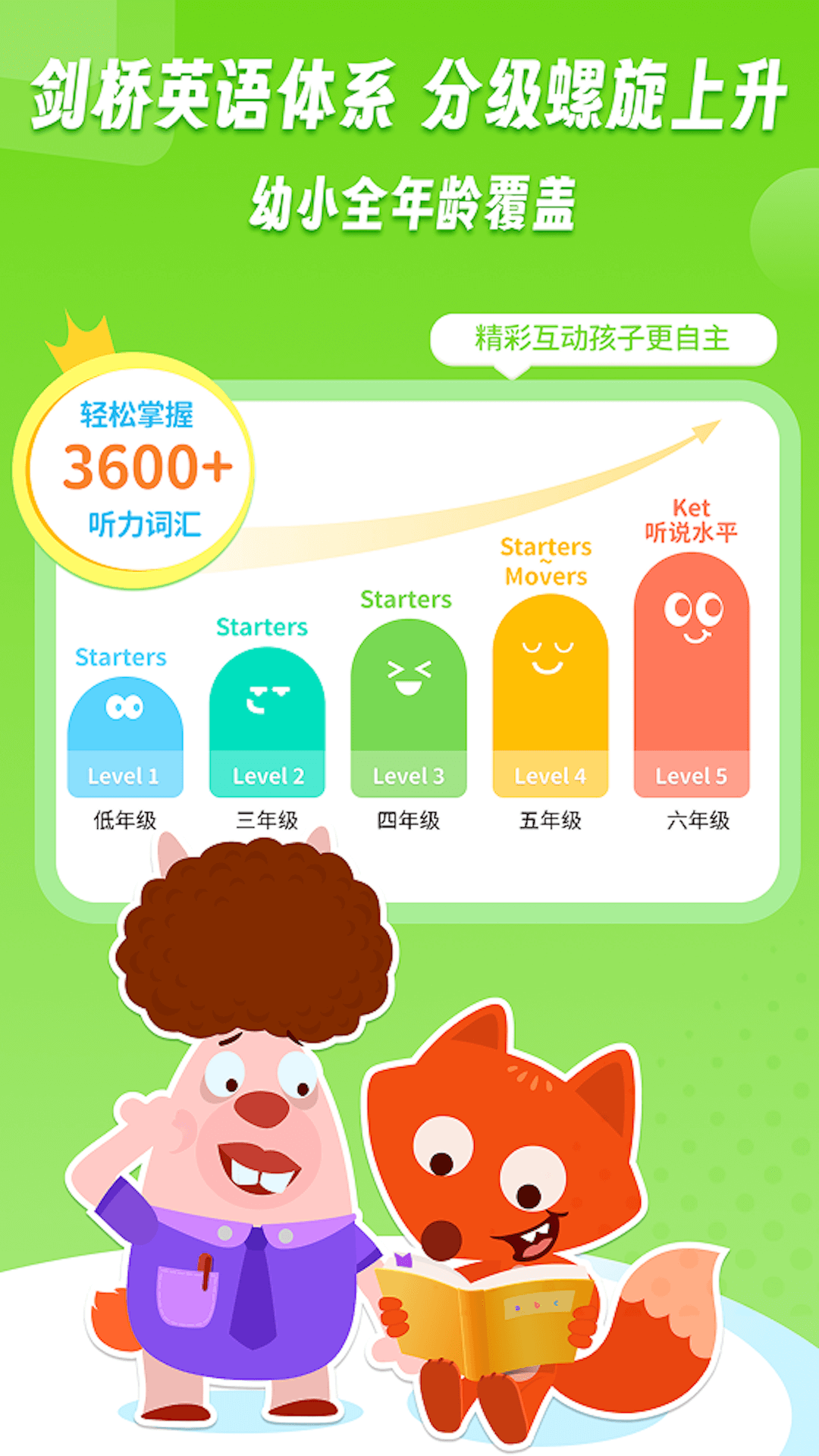 01 全球1000万+家庭信赖 150集沉浸式英语故事,东方版【哈利波特】,大量冒险、魔法等题材,孩子化身主角参与剧情互动,让孩子趣味学习; 02 好莱坞演员原声配音,超5100分钟原版对话 与剑桥大学教育研究生院专家合作开发,Hollywood好莱坞配音演员原声录制,超5100分钟的对话,输入纯正美音,对【中式英语】说拜拜; 03 真实生活场景,超2500+单词卡片 丰富的生活化场景:饭店、书店、农场、超市等,超2500+日常对话词、句,让孩子掌握大量单词的同时可以充分开口表达,从而培养纯正流畅的语言能力; 04 丰富配套工具,秒变学习神器 1000+好玩的卡片闯关游戏,激发兴趣,增强记忆;50首动感儿歌,1000+分钟小狐狸FM熏听,2500+拓展训练,海量配套学习工具,秒变学习神器。