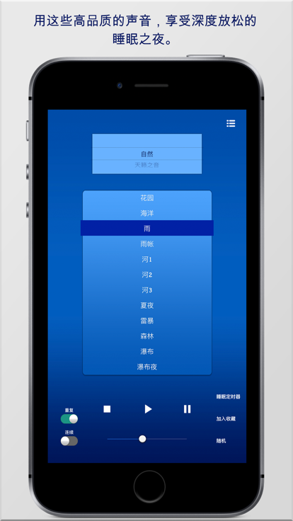 * 被CNN列为适合旅行者的最佳新款应用程序。* 睡眠有困难?快速入睡,剩下的让助眠声音高清版来帮您。 该软件精选来自世界各地的600多种放松音乐,即刻放松您疲惫不堪的神经,数分钟内入睡,享受酣睡的感觉,醒过来感觉精力十足。 更好的睡眠质量会提升您的健康水平,缓解压力,增强创造力,让您看起来感觉更年轻。 催眠音乐让您可以即刻欣赏大量的高品质、纯天然音乐。比人造声响和短期重复声音更好,这些是真正的自然声音,具有来自自然环境所有的丰富质感、特征和细微差别。 想象一下在以下环境入睡:巴厘岛的梯田上,下着绵绵细雨,有节奏的波浪轻轻地拍打着葡萄牙鹅卵石沙滩,瑞士阿尔卑斯山中的舒缓瀑布,潺潺的大峡谷溪流,澳大利亚内陆夜晚的蟋蟀声,熊熊燃烧的温暖篝火旁,瑟瑟的秋叶落地声,迷人的风铃声,或者在高原上蜿蜒的绵羊叫声。 或...如果您喜欢连续的“纯声音”,可以使用如下节奏入睡,列车通过泰国乡村隆隆声,荷兰公路的嗡嗡声,工作中的面粉厂,洗碗机和纺纱洗衣机,或纯白色、粉红色和棕色声音。 您会很快入睡,醒来后感觉容光焕发。 更重要的是,您随时可在需要时使用助眠声音高清版来阻挡外界噪声: •通过去除杂念,提高您的专注能力,并在工作中更有创造力。 •让您的婴儿或小孩放松下来,并为您和您的家人创造一个宁静的世外桃源。 •通过阻断来自嘈杂邻居、制冰机和电梯门的噪声,将您的酒店房间变成一个熟悉的睡眠绿洲。 •为您创建一个平静和安宁的环境,可以冥想和瑜伽。 有超过600的高品质音轨可供选择,可以根据您的个人品味微调声音集合。 如果这还不够,您可以创建自己的个性化混合音乐用于睡眠、工作、旅行、午睡时间或冥想,一次可混合多达6种声音。 改善您的睡眠,提高您的健康,您的幸福感从今晚开始。 助眠声音高清版特点: •记录世界各地600 +的自然声音 •长时间的高品质录音 •现代化易于使用的界面,专为夜间使用 •睡眠定时器,带有音频缓慢播放功能,可用一个简单的开关进行设置 •易于创建的任意6种声音混合功能,具有35万亿种可能的组合 •来自世界各地的全屏绚丽图像 •便捷的搜索功能,发现您最喜欢的声音 •使用其他应用程序或当屏幕被锁定时,可在后台运行 •19种声音类别,包括雨、海洋、河流和溪流、蟋蟀和昆虫、青蛙、风铃、湖泊、风、喷泉、火、鸟、动物、汽车、火车、公共场所、家庭、钟声、工业、音乐场景 现在下载助眠声音高清版快速入睡,获得您需要的休息。 图像摄影者:http://www.phase4mobile.com/image-credits/