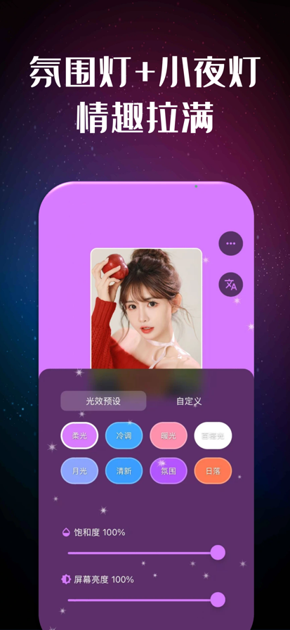 专业的拍摄补光打光软件。 将您的手机屏幕变成氛围灯,轻松调色! 【单色灯关】自定义灯光亮度饱和度; 【彩色灯关】自带紫光、蓝光、柔和光、白日光等颜色; 【渐变灯关】自定义颜色组合,固定间隔时间来变换灯光。 一键打光!让直播、聊天、拍照或短视频拍摄打光、补光更便捷。 会员订阅: 订阅价格为每年48元、每月18元。 订阅会自动续订,除非在当前期间结束前至少24小时关闭自动续订;帐户将在当前期间结束前24小时内收取续订费用,并确定续订费用 订阅可以由用户管理,并且可以在购买后转到用户的AppStore帐户设置来关闭自动续订 隐私政策:https://shimo.im/docs/473QM8OvBMhP2z3w 使用条款:https://shimo.im/docs/473QM8Ov5ahPdO3w