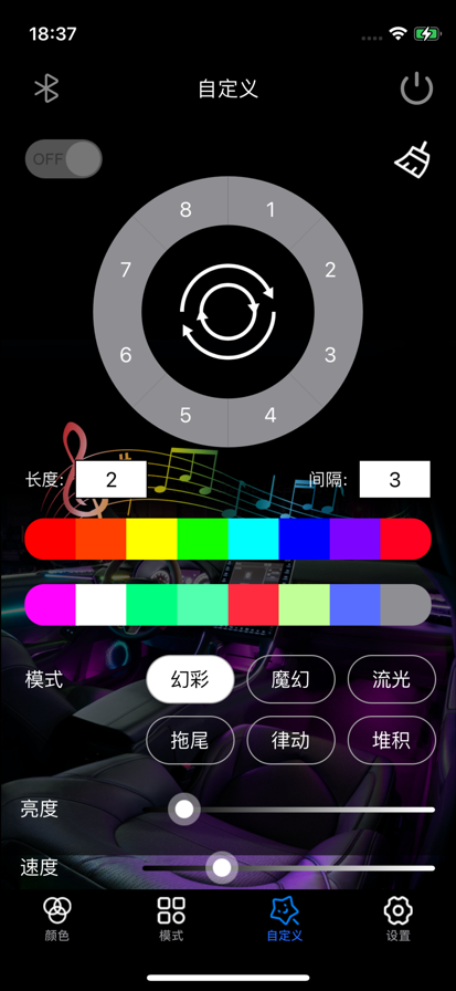 一款控制氛围灯的手机App,通过手机蓝牙连接氛围灯设备,可以控制设备实现不同的色彩模式。App支持分区调节各种颜色,用户可以随心所欲选择喜欢的颜色;支持20种不同的幻彩模式,功能效果更加炫酷;支持分区亮度调节功能,用户可以根据需求实现不同效果;支持动态呼吸模式,视觉效果更加突出。App功能简单、易用,欢迎下载!