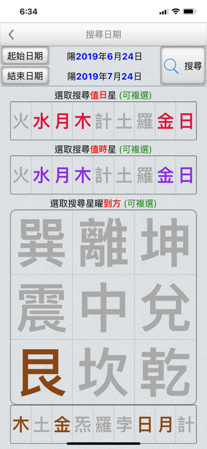 玄空大卦万年历是一个「玄空大卦择日」的辅助工具,并提灵活的条件式搜寻,更多功能如下: 》玄空大卦: ●月历:可上下滑动来调整月份。 ●提供直接输入「阳历、农历、干支」来显示内容。 ●提供快速调整日期「加/减月,加/减日,加/减时」功能。 ●显示内容包括: ●人(命主):可点下后输入生日。 ●山(坐山):可点下后输入坐山:它其提供了: ●选择干支。 ●选择罗盘:(可由参数内设定) ●电子罗盘:利用手机的电子罗盘功能,自动测量方位。 ●手动罗盘:可用两指缩放罗盘大小,单指旋转方位。 ●年月日时玄空卦气及卦运。 ●阳历、农历、节气交接时间、四柱。 》条件搜寻: ●指定起始日期~结束日期之范围,并可选择下列搜寻条件: ●选取搜寻要避开的项目(可复选) ●冲命主 ●冲坐山 ●日时冲 ●三煞方 ●选取符合的五吉(可复选) ●生入 ●克入 ●同旺 ●生成 ●合十 ●选取符合的格局(可复选) ●一卦纯清 ●归中旺气 ●生成旺气 ●卦不出位 ●归中吉格 ●生成吉格 ●颠倒挨星 ●搜寻到的日期列表内,会提示日期符合的项目。 》偏好设定: ●周首日:设定一周开始的星期。 ●四柱顺序:人山年月日时、时日月年山人。 ●夜子时:提供夜子时设定。 ●输入坐山:选择干支、选择罗盘。 ●语言地区:可随时切换介面语言,提供繁体中文、简体中文。 ●介面字型:提供字型大小调整。 ●萤幕锁定:不锁定可长时间使用,萤幕不会关闭。 ●万年历提供:西元 1600 ~ 2200 年。 ●操作介面:繁体中文、简体中文。 ●同时支援 iPad 大萤幕任意方向显示。