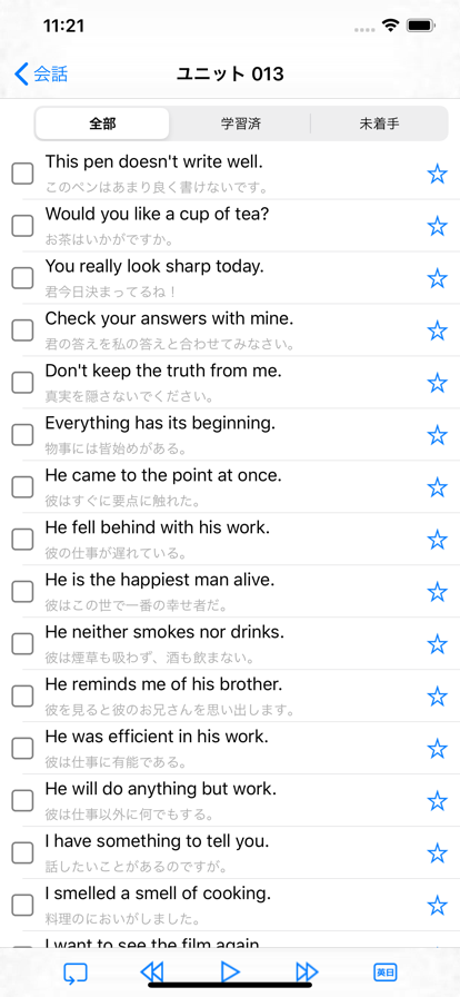 英语学习的捷径就是朗读,背诵,日积月累。背诵单词往往记忆效果不佳,如果能够把整句话记住,里面的单词自然而然的记忆就得到了强化的效果。本APP精选了800句基本日常生活 用语,涵盖了生活的各个方面以及各种基本句型,带有真人发音。这些句子虽然看上去都明白,但是能灵活运用到生活中就比较困难,这就是哑巴英语。如果不局限于看明白,而是达到能张口就来的程度,就要不断的听,不断的说才能达到学习英语的听说效果。希望对您的英语学习起到一定的作用。 主要功能 1. 800句日常会话 由简入繁,逐步深入,默认分为30个单元,单元句数可以自由设定。 2. 中英翻译 支持中英显示,中文显示,英文显示三种模式 3. 英语发音 英语发音可以连续播放,循环播放,单句播放。 4.学习分类 根据是否掌握进行分类显示 5.收藏功能 可以添加删除自己喜欢或者需要反复记忆的句子。
