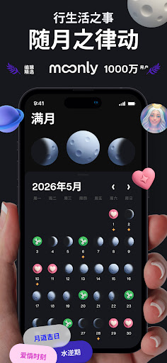 Moonly:您的个人占星师与心灵向导<br><br>通过 Moonly 与宇宙的节律及自然的能量校准,它将是您通往正念、自我发现与古老智慧的个人向导。探索一个充满灵性修行、占星术和月相仪式的世界,旨在帮助您与内在的自己建立深层连接。<br><br>每日指引,为您量身定制<br>根据您的个人星盘档案,我们为您精心策划了此刻专属的微仪式、深刻洞见与正念提醒。<br><br>阴历<br>使用基于东方占星术的精准日历,追踪月相、天体事件以及与月亮周期相关的节日。获取针对特定月相的建议,在几分钟内提升情绪、专注力和创造力。了解何时休息、行动或反思,以达到最佳状态。探索每日小贴士、满月和新月仪式,以及行星逆行的洞见,让您的生活与宇宙能量同频。<br><br>个人占星师<br>与应用内的占星师交谈,咨询关于职业发展、旅行日期或自我关怀的问题,并在几秒钟内获得基于您出生星盘的清晰解答。<br><br>个人行运<br>了解您每一个行动的“绿灯”窗口期。让您的专注力、运气和成果倍增。<br><br>冥想与仪式<br>通过引导式冥想来培养正念和放松,包括用于提升专注力的铜锣浴和用于深度恢复性休息的睡眠冥想。利用满月和新月仪式的力量来设定意图、释放负能量,并在生活中创造积极的改变。这些练习将帮助您每一天都保持脚踏实地和充满灵感。<br><br>肯定语与知识<br>通过与月亮能量校准的每日肯定语来转变您的思维模式,增强积极性、自信和自我意识。深入阅读富有洞见的文章和课程,探索月亮周期、占星术和灵性修行背后的深层含义,助您在自我发现的旅程中成长和拥抱一切。<br><br>出生星盘与占星术<br>通过基于东方吠陀占星术的详细出生星盘(本命盘)解锁个性化洞见。借助这一强大工具,理解您的业力、独特特质和潜力。探索每日星座运势和天体影响,以清晰和目标感来应对生活中的挑战与机遇。<br><br>相配度<br>一键解读爱情、友谊和工作中的化学反应。在问题出现之前,精准定位优势与挑战。<br><br>塔罗牌与卢恩符文<br>通过塔罗牌解读获得清晰的指引,为您的生命道路和决策提供洞见。向古老的卢恩符文寻求答案,这是一个永恒的神谕系统,为现在和未来提供智慧。这两种工具都能赋予您力量,让您做出自信的选择并拥抱积极的改变。<br><br>获取您的个人月相向导,集冥想、仪式、占星术、塔罗牌、卢恩符文等功能于一体。改变您的日常,拥抱月亮智慧带来的和谐。<br><br>欢迎发送您的反馈: hi@moonly.app<br>隐私政策与使用条款:<br>moonly.app/privacy<br>moonly.app/terms