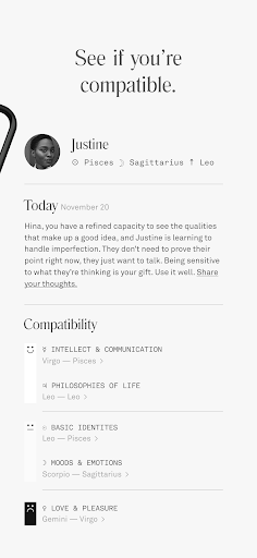 Co–Star 是一款占星应用程序,它通过 NASA 数据和尖锐的真相来破译人际关系的奥秘。 2x 每日最佳应用。纽约时报、Vogue、名利场等刊登。<br><br>> “好建议。”纽约时报<br>> “敲打占星术应用程序。”杜阿利帕<br>> “就你的星座与人交流。”康纳·奥伯斯特<br><br>特征<br>• 添加好友以比较本命盘并查看您的兼容性。<br>• 阅读个性化的每日星座运势。<br>• 根据您当天的星座接收每日推送通知。<br>• 学习如何阅读你的整个星盘。<br><br>高级功能<br>• 查看未安装该应用程序的人的完整出生图。<br>• 获得关于您如何爱以及为什么爱的完整个性化报告。<br>• 对于情侣,Eros,一项功能可让您深入了解如何根据您的生肖兼容性驾驭日常关系情况。<br><br>没有不好的星座,只有复杂的动态。 Co–Star 使用占星术作为理解我们自己和我们的关系的框架;在闲聊的海洋中进行真正交谈的捷径。我们使用 NASA 数据实时绘制恒星的确切位置。然后由真正的人类占星家解释,他们与 AI 技术合作,生成您在应用程序中阅读的出生图和每日星座运势。<br><br>到处跟着我们<br>• Instagram:https://www.instagram.com/costarstrology/<br>• Tiktok:https://www.tiktok.com/@costarastrology<br>• 推特:https://twitter.com/costarastrology<br><br>需要帮忙?给我们发电子邮件:horoscopes@costarstrology.com<br>我们不会用您的数据做令人毛骨悚然的事情 —> costarastrology.com/privacy<br>条款 —> https://www.costarastrology.com/terms