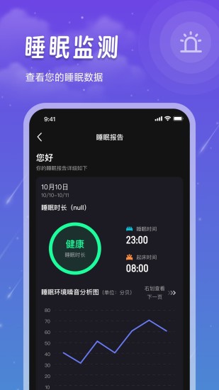 全新UI界面,震撼上线,丰富的助眠音乐库同步更新,期待您的使用。 睡眠精灵睡眠检测助眠,睡眠助手记录梦话录音,鼾声,分析睡眠时间,培养健康早睡习惯,获得优质睡眠,帮助快速入睡的好睡眠软件。 睡眠精灵为您提供了睡眠记录、睡眠监测、睡眠音乐、梦话录音、睡眠分析、健康贴士等多种功能,一目了然的sleep数据让您准确监测自己的睡眠质量,助您解决“睡眠拖延症”,睡眠音乐让你感受到舒适的音乐下冥想静心,停止打鼾,缓缓入睡, 睡眠锁屏——就轻点“开始睡眠”开始锁屏,进入您的黄金睡眠时刻,健康的睡眠习惯从此刻开始。 睡眠监测——从开始到结束,无需穿戴设备,就可记录你的睡眠时间、深睡浅睡情况,还可以记录你的鼾声。起床即生成睡眠报告,让您每天监督自己,了解您的睡眠习惯,做一个越来越健康的人。 助眠音乐——睡不着?涓涓的泉水、寂静森林的虫鸣、美妙的钢琴协奏曲、当代的流行音乐,白噪音,潮汐声,多种类的自然音乐可供您多样化的选择,帮助你在舒适的音乐中冥想静心,安然催眠入睡,不在打呼噜。 睡眠分析——睡眠追踪,详细全面的图表数据分析,图表明确详细,简洁易懂,包括深度睡眠,浅睡,醒,梦等。