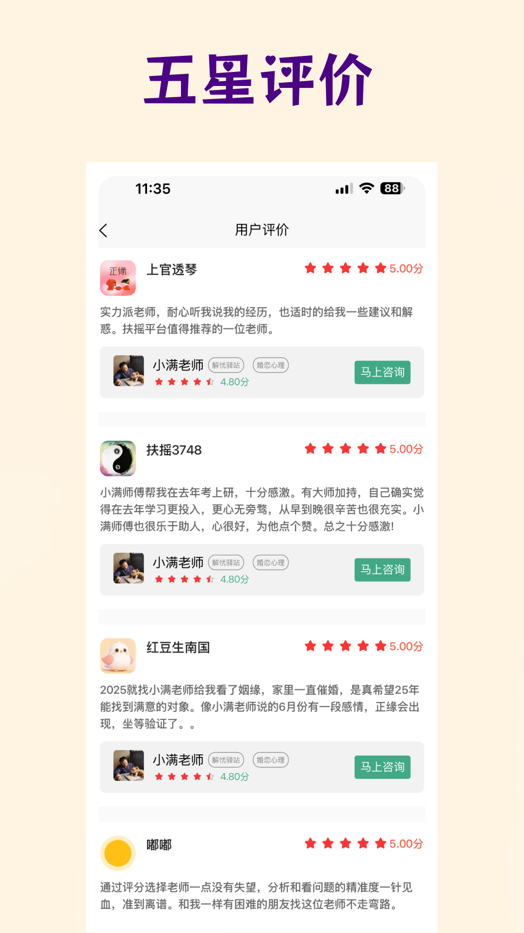 扶摇是已经运营10年的国学婚姻情感事业咨询类APP。<br>十年间严格筛选了一批全国各地的专业能力强,响应速度快,服务态度好的国学老师。一站式情感倾诉疗愈,承包你的全周期心理呵护。从婚姻咨询,专业疏导,到科学冥想、答疑解惑,满足不同需求。银行级加密保护隐私,安全无顾虑。无论深夜还是清晨,随时为你提供温暖陪伴,驱散阴霾,拥抱阳光。