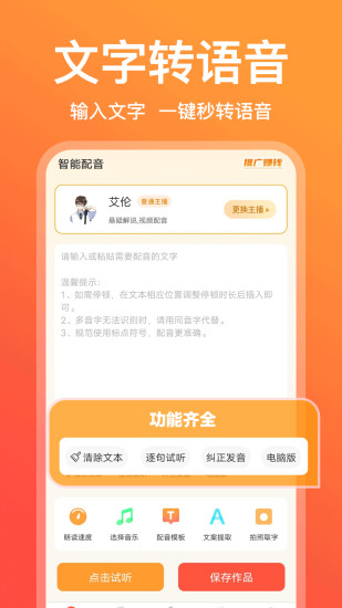 配音鹅是一款文字转语音的专业语音合成助手配音软件,采用强大的语音合成技术,高拟真度发音,打造简单便捷的配音服务平台,实现在线文字转语音。 内置了近300位AI合成配音主播发音人,可选不同说话风格,广泛适用于广告配音、新媒体短视频配音、有声阅读、铃声制作、公司宣传广告、课件配音、超市促销甩卖、地摊叫卖、商场促销、地铁播报、有声朗读叫卖等等各个场景。 【功能特点】 1、 声音风格:近300位AI合成配音主播发音人,任你选~; 2、 语速调节:自由调节配音语速; 3、 海量广告模板:广告促销,地摊叫卖,美食餐厅,产品宣传等众多行业模板任您自由选择; 4、 停顿调节:可调节发音人停顿语气; 5、 背景音乐:个性化设置背景音乐,让您的配音作品更精彩; 6、 分享保存:微信分享,朋友圈分享,可保存MP3.MP4格式 7、 音频编辑工具:音频拼接、音频剪辑、音量调节、格式转换、改背景音乐、音频修改