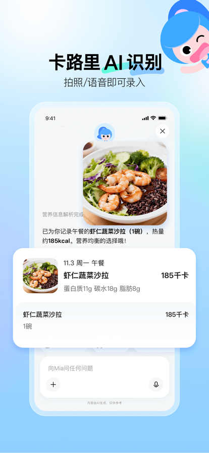 专为“外卖党”设计的 AI 减脂助手: 记录外卖与零食热量,拍照/文字即可识别营养; 自动安排每日小目标+打卡;纠结吃什么?一句“帮我点”,优先推荐更健康、更低卡的外卖组合。 还有 1v1 健康咨询,聊得越多越懂你。 不研究复杂减脂知识,也不必死磕健身房。把“今天吃什么”交给 Mia,外卖党也能变瘦。 Mia 的核心功能 → ■ 外卖订单记录:自动同步外卖订单,识别菜品与营养,生成热量账本。 ■ 卡路里 AI 识别(拍照/文字):拍食物、拍菜单、拍营养表,秒出热量与三大营养素; ■ 安排每日任务 + 打卡:根据你的体重、作息与目标生成每日行动清单(喝水、步数、作息、饮食提醒),完成即可打卡,连续达成有奖励。 ■ 帮你点外卖:一句“帮我点”,根据每餐所需,推荐健康搭配,方便、低脂又健康。 ■ 健康咨询 + 越聊越懂你:关于低脂搭配、碳水时机、加班夜宵、社交聚餐…随时问;Mia 会记住你的喜好与忌口,逐步个性化建议。 喜欢 Mia 的大家怎么说 → ■ “点外卖不再担心了,有口味不错但热量更低的选项。” ■ “拍一下就知道热量,省去查询计算的时间。” ■ “任务小而清晰,连着打卡更有动力。” ■ “能记住我的口味与忌口,推荐越来越准。” 温馨提示 Mia 提供的营养与健康建议仅用于一般健康管理参考,不能替代医生或营养师的个体化诊疗。若有特殊人群(孕期、哺乳期、慢性病、术后恢复等)或不适,请先咨询专业人士。
