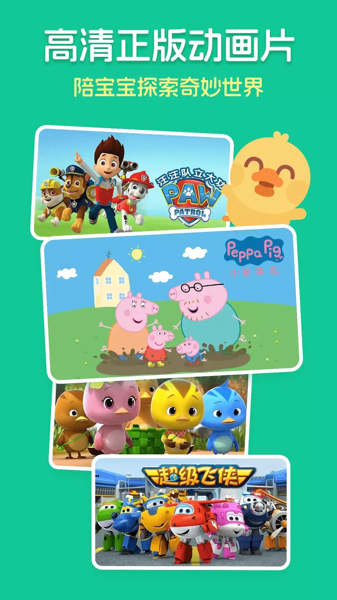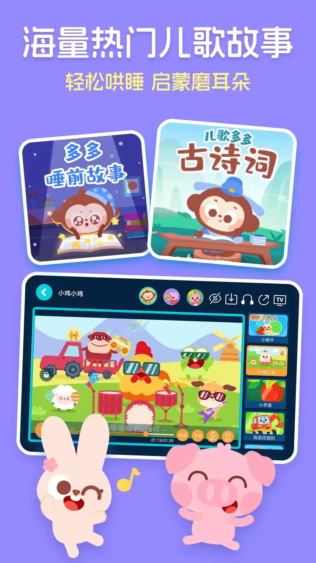 由儿歌多多团队精心打造,爸爸妈妈的好选择,小朋友都喜欢! 百万儿歌故事、动画绘本、真人舞蹈、手工画画……更多优选内容只为给孩子一个快乐的童年。 ▲ 主要功能 【宝宝看】 儿歌多多原创精选儿歌故事动画片,更有成语寓言故事,绘本动画,手工画画,真人儿歌舞蹈及趣味英文动画等内容,深受家长和小朋友们的喜爱。 还收录了海量宝宝喜爱的热门动画片:小猪佩奇、汪汪队、喜羊羊与灰太狼、倒霉熊、超级飞侠、兔小贝、啵乐乐、可可小爱、迷你特工队、海底小纵队、瑞奇宝宝、太友和萌鸡小队……等,超多小朋友喜爱的动画明星都在这里聚集,陪伴宝宝一起成长! 【宝宝听】 热门好听的儿歌童谣、哄睡音乐,还有经典有趣的睡前故事、童话故事、成语故事等丰富的有声内容。 经典儿歌:小星星、小燕子、白龙马、两只老虎、粉刷匠、刷牙歌、大风车、一分钱、我爱我的幼儿园...... 哄睡音乐:宝宝快睡吧、摇篮曲、洋娃娃的梦醒、安静纯音乐...... 快乐童谣:生日快乐、聪明的一休、虫儿飞、采蘑菇的小姑娘、小螺号、字母歌、jingle bells、if you are happy、Merry Christmas…… 经典睡前故事:白雪公主、三只小猪、灰姑娘、猪八戒吃西瓜、睡美人...... 安徒生童话:海的女儿、拇指姑娘、皇帝的新装、丑小鸭、公主与豌豆、卖火柴的小女孩...... 趣味成语故事:画龙点睛、掩耳盗铃、对牛弹琴、刻舟求剑、狐假虎威...... 贴心选择适合不同年龄段小朋友收听的内容,高清好音质更适合家长和小朋友们。 【宝宝学】 涵盖颜色、形状、数字、文字、音乐等多个领域,通过不同的场景和故事来激发小朋友认知新事物的兴趣,开阔宝宝的视野,激发宝宝无限潜能,还推出多多救援队、多多小警察、多多的节日、多多超市、多多医院、多多恐龙车、多多爱郊游……等亲子互动场景,让宝宝随时随地都能快快乐乐玩耍,轻轻松松学本领。 儿歌多多,宝妈宝爸的哄娃神器,千万家庭的小朋友都在使用,快乐童年不可缺失的好伴侣!