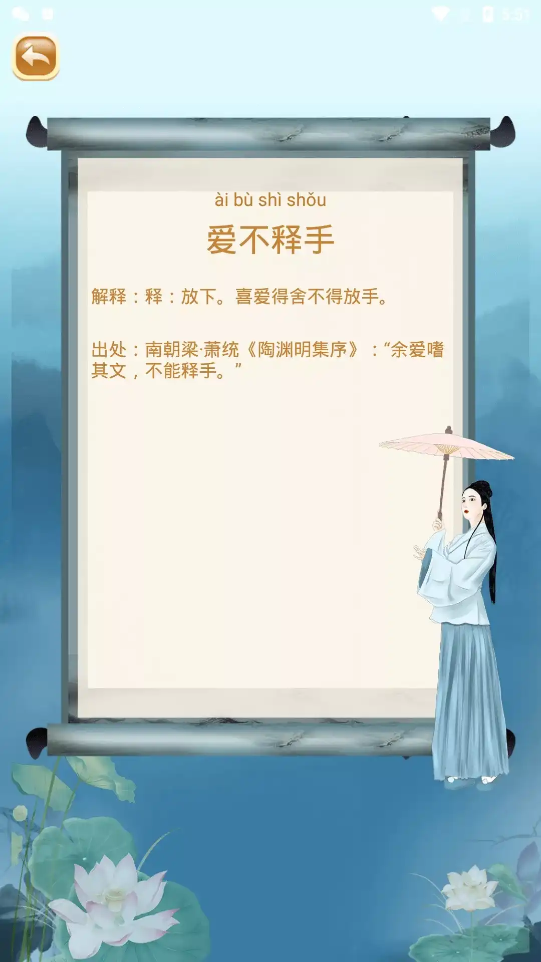 国学成语词典,开启您的国学之旅~ 领略国学魅力,弘扬传统文化,国学知识,等您来传承 国学成语词典涵盖了诸子百家、四书五经、文学名著、二十四史、唐诗宋词等国学典籍和数万个常用成语及其解释。为广大学龄前儿童以及其父母带来方便的查阅工具。 国学成语词典倾力打造中华传统文化的国学应用。应用集专业性、阅读性、知识性、趣味性于一体 主要功能: 1、诗词库丰富全面: 包括唐诗三百首、三字经、弟子规、千字文、百家姓等内容,同时提供诗词的注解、释义和鉴赏。并配备专业语音朗诵,巩固记忆力 2、内含成语接龙和古诗填空等游戏,记忆高效又有趣,让您学习不枯燥。 3、可以根据所学内容同步录音阅读,学习更高效。 4、内容均可收藏,并含有学习记录,您可以方便找到自己喜欢的国学内容。 5、每日赏析:每天推荐不同的古诗词,创意的卡片式左右翻阅,配上水墨风插画背景匹配正文大意,方便学习与理解。 国学成语词典可以帮助孩子更好地学习和掌握国学知识,让孩子在趣味中掌握现代汉语成语的知识。 可以更便捷、更全面、更自由地触达到更广阔的中华诗词以及中华优秀传统文化领域