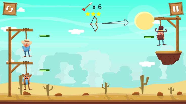 传言百步穿杨是箭术的至高境界,现在就让我们用高超箭术拯救被困的囚犯! 这是一款非常有意思的游戏,你要扮演救人的英雄,拯救那些正在绞架上与死神抗争的可怜的人们。拉动你手中的弓箭,将他们身上的绳子射断,尽量避免在他们身上射一箭,你的任务是救人,可不是做雪上加霜落井下石的事。这里在物理基础上加入射击玩法,用弓箭救下正在受绞刑的好人。可以熟练地培养弓箭的抛物线手感,还要避开重重障碍,因为被吊着的人体力和生命值会迅速下降的。用有限的条件创造无限的可能。每个关卡都有有限的弓箭,需要在弓箭未用完之前将所有人救下。游戏里还有很多道具,要充分利用好这些道具,当然精准的射击也很重要,除了救人之外,还可以在游戏射击道具来获得更高的分数,例如增加弓箭,加分,甚至是变换发射位置等。