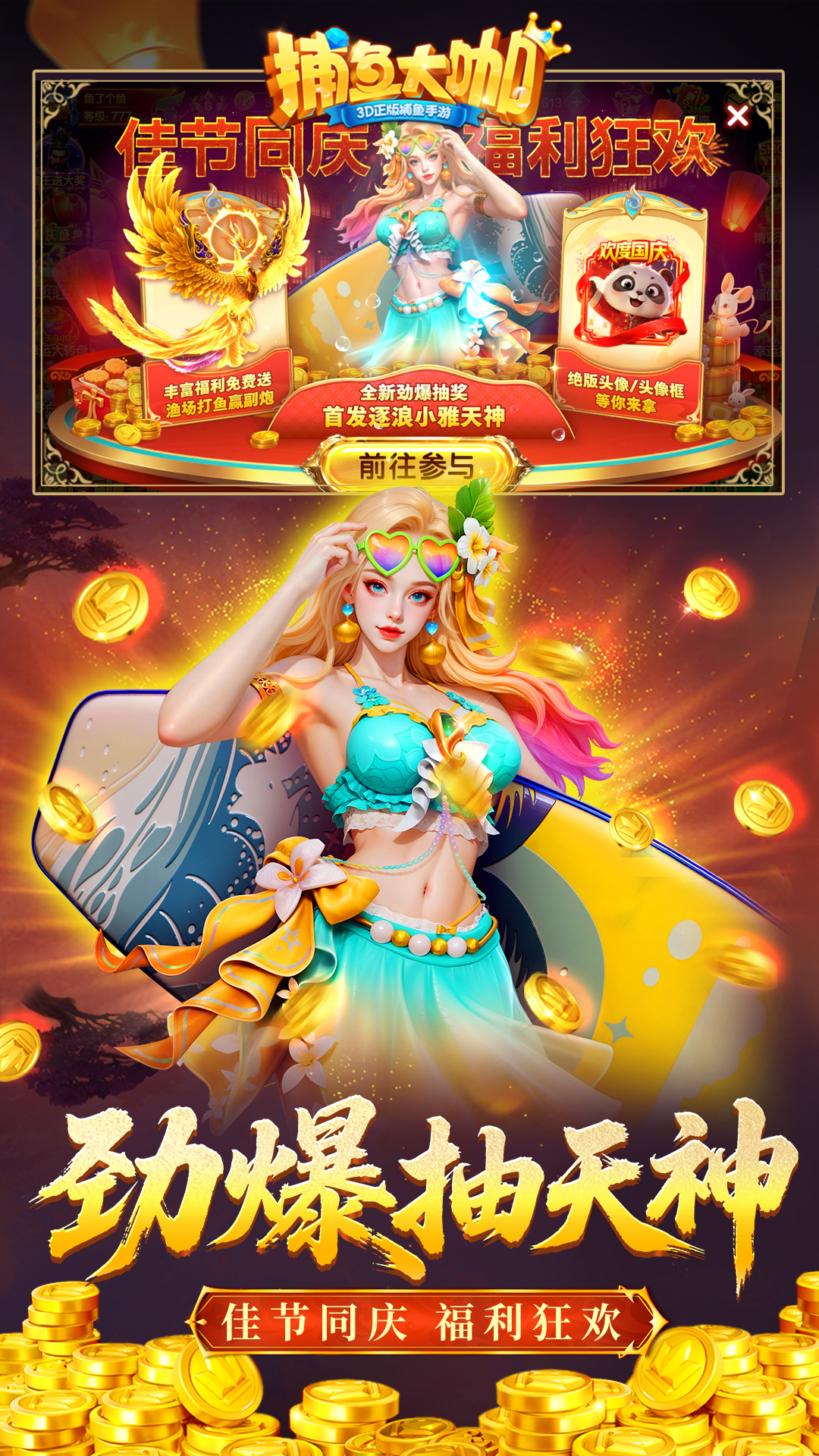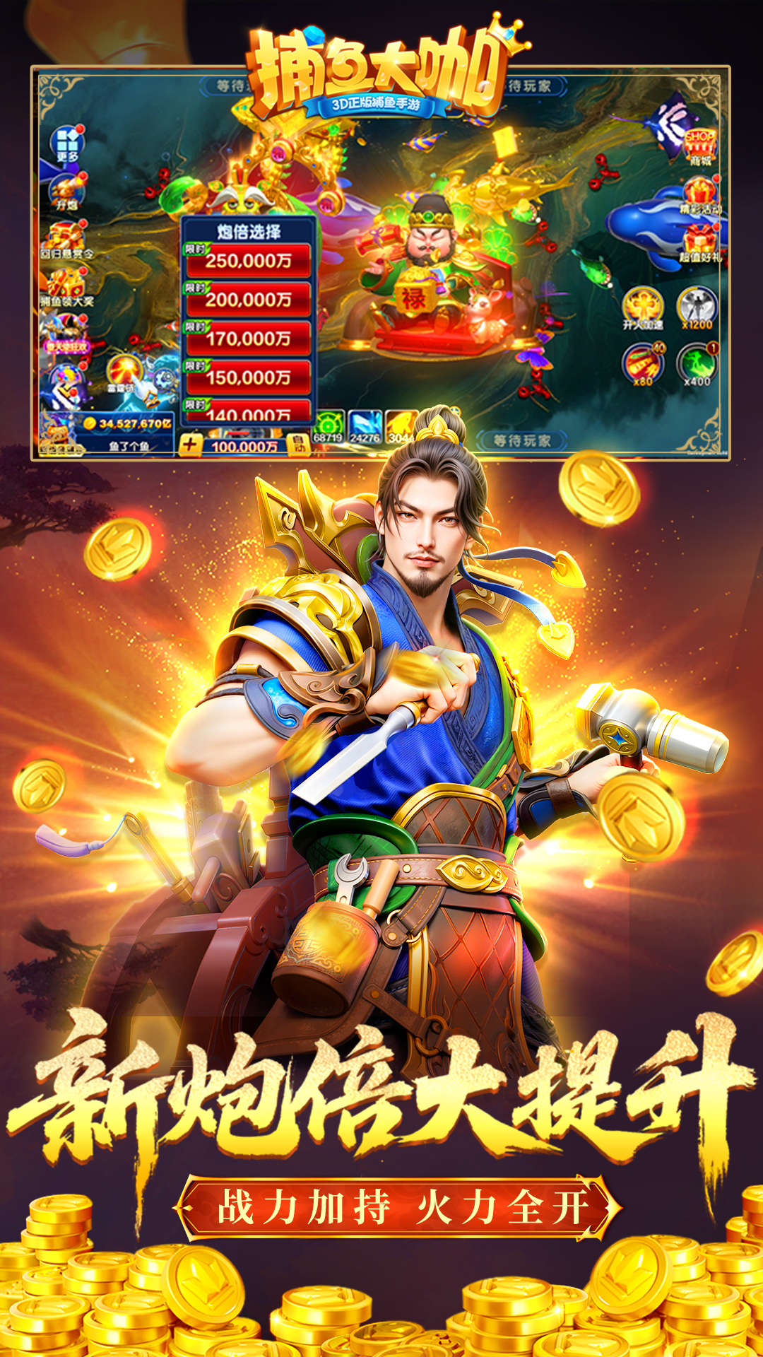 【超值礼包】兑换码:dsj123、dsj999<br>【领取方式】打开游戏→右上角更多→兑换码<br>捕鱼老玩家力荐!真3D原汁原味,实时对战挑战捕鱼高手,来《捕鱼大世界》一键清空渔场!<br><br>【延续经典,初心不变】<br>巅峰巨作,正版捕鱼升级,打破捕鱼次元壁!<br>经典玩法,画面升级,比赛、炮战、竞技、PK,多种模式,好玩到停不下来!<br>【真3D全景,沉浸式画面】<br>3D高精度美术建模,极致场景,视觉盛宴!<br>全景画面,史诗BOSS,酷炫特效,体验真实爆机感!<br>全新引擎,加倍流畅,游戏不卡顿,操控无压力!<br>【超高爆率,万倍收益】<br>海量金币免费领,千倍大炮免费升,不氪畅快玩!<br>炮台全面升级,超级BOSS万倍爆率,秒变大富翁!<br>【真人炮台,角色百变】<br>海岛公主、热血青年、圣洁天使与霸气恶魔,您想要的风格这里都有!<br>【创新RPG,任意闯关】<br>捕鱼+RPG?创新RPG闯关玩法,完成任务可获得永久角色炮台小道士!<br>免费炮台轻松得!过关斩将,捕鱼快人一步!