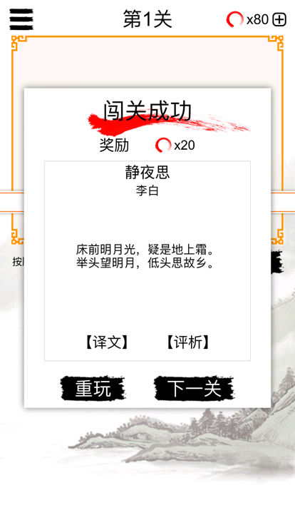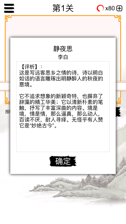 作为一个中国人,我们总是对古诗词有一种崇敬。从刚刚学会说话我们就学了各种各样的古诗,从静夜思到登鹳雀楼不一而足。学古诗简直是学习中国话的一个必不可少的部分。即使还不能理解其中的深意,我们还是可以熟练的背出几首。 但是,相比于我们背诵过的,我们理解的太少。这些传唱千年的作品为什么能够流传到今天?它们可不是靠成为考试的考点才流传。古人有着与今人一样的喜怒哀乐,古人也一样会有悲欢离合。古人也会在长安城的客店里思念故乡,一如今日的北漂在皇城根的出租屋里回想少年时光。古人在与知交故旧相会时放歌纵酒,一如今天的朋友聚会时一起唱歌一起high。古人会唱起怀才不遇的悲歌,一如今天的普通人在现实中埋藏了儿时的梦想。古人会在游览名胜的时候记述凭吊一番,一如今人在旅游时拍个照分享个朋友圈。古人与今人在情感上是相通的。正是这种相通的情感让这些佳作一代代流传下来。 这款游戏正是从理解诗词的意思及创作背景的角度出发。从意到文,再到创作背景。帮助你在游戏中理解古诗的字句之优美情感之深沉。 100余首古诗关卡,让你玩过瘾。从此爱上古诗词。 每首诗都有详细的译文和评析,可以仔细玩味。 遇到难题也不要紧,还有提示帮助你。 登录排列榜与好友比拼最高关卡。