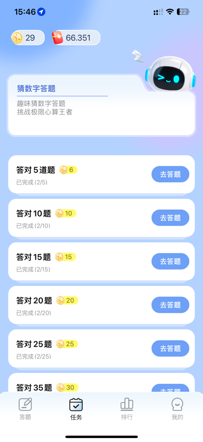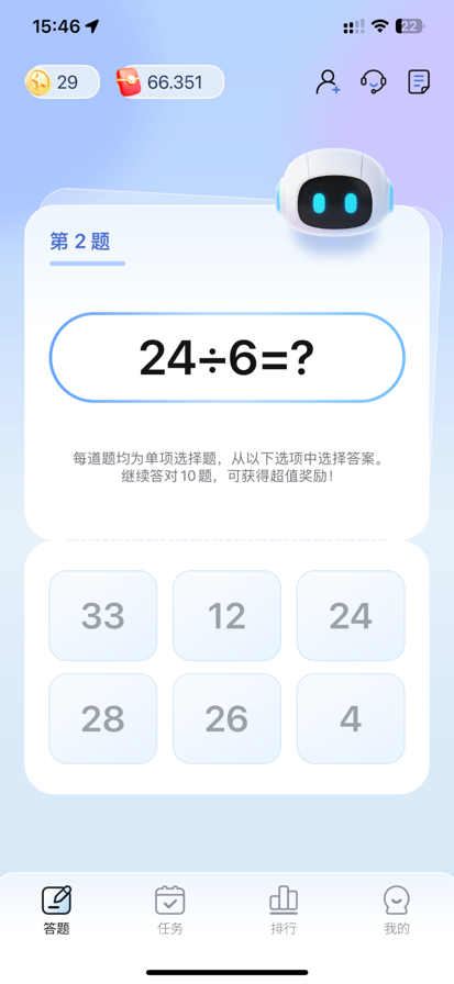 「猜题赚」是一款轻松有趣的益智答题应用。 在这里,你可以通过回答各种有趣的数学题来锻炼思维,提升计算能力。题目覆盖从基础运算到逻辑推理,不仅考验你的反应速度,还能帮你在娱乐中不断进步。 主要特色: • 丰富题库:从简单加减到烧脑推理,总有适合你的关卡。 • 轻松挑战:随时随地打开就能答题,碎片时间也能玩。 • 脑力提升:在娱乐中不断训练思维,让大脑保持灵活。 • 排行榜竞技:与朋友或其他玩家比拼成绩,看看谁才是“答题小能手”。 快来加入答题挑战,让脑力全开,享受解题带来的乐趣吧!