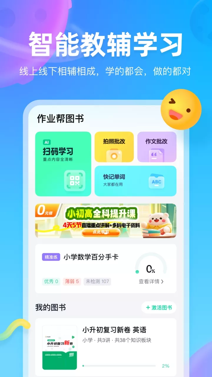 作业帮图书是作业帮旗下全新推出的智能教辅产品,以纸质教辅为基础,线上智能学习强力辅助,为每一位学生提供丰富的视频资源和海量题目,真正实现线上线下高效学习。 【产品特色】 清晰完整的知识点框架打通线下教辅,一键扫码实现高效学练;线上错题本灵活管理错题难题,让薄弱点学习更有针对性;题目拍照一秒批改,帮你智能判对错。 【产品功能】 1、扫码学习 - 扫码观看视频讲解,足不出户秒学解题大招 2、智能批改 - 题目试卷拍照即改,作答结果秒出正误判断 3、错题本 - 错题难题一键添加,随时订正实现高效管理 4、举一反三 - 海量题库在线练习,拓展巩固掌握各类题型 5、学习报告 - 学习效果清晰呈现,全面诊断各环节薄弱点 【意见反馈&联系我们】 如有任何疑问,我们会帮您快速解决哦,请联系: 客服邮箱:zybbook@zuoyebang.com 客服电话:400-611-0100