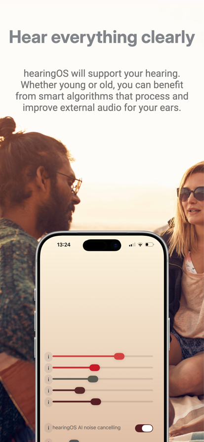 hearingOS 是全球领先的助听器应用程序 清晰聆听一切 - hearingOS 将为您的听力保驾护航。无论您是年轻人还是老年人,都能受益于智能算法,这些算法可以处理并改善您耳朵听到的外部音频。 更清晰的语音理解 - hearingOS 采用先进的人工智能技术来抑制噪音,提高语音清晰度。 - 信号通过智能算法放大器放大,同时抑制噪音。 兼容无线和有线耳机 - 支持几乎所有可通过蓝牙或有线连接的耳机,包括 Apple AirPods。 自动调节,贴合您的耳朵 - 滑动滑块上的彩色圆点,即可立即感受到差异。每个人的情况和使用环境都不同。 hearingOS 是 iOS App Store 上排名第一的助听器应用程序、音频增强器、声音放大器、听力助手和聆听设备。 隐私政策和服务条款请访问:http://www.hearingos.com/tos。订阅 - 价格和条款 HearingOS 可免费下载。所有用户均可免费试用 7 天。如果您想继续使用 hearingOS,我们将自动续订。 免费试用期结束后,您需要订阅该应用,可以选择按月或按年付费。订单确认后,我们将从您的 iTunes 账户中扣款。如果您未在续订日期前至少 24 小时取消自动续订,则订阅将自动续订。续订价格不变。订阅会自动续订,但您可以随时取消。 您可以在 iTunes 账户设置中管理您的订阅,并可随时取消自动续订。购买后,未使用的订阅期部分不予退款。