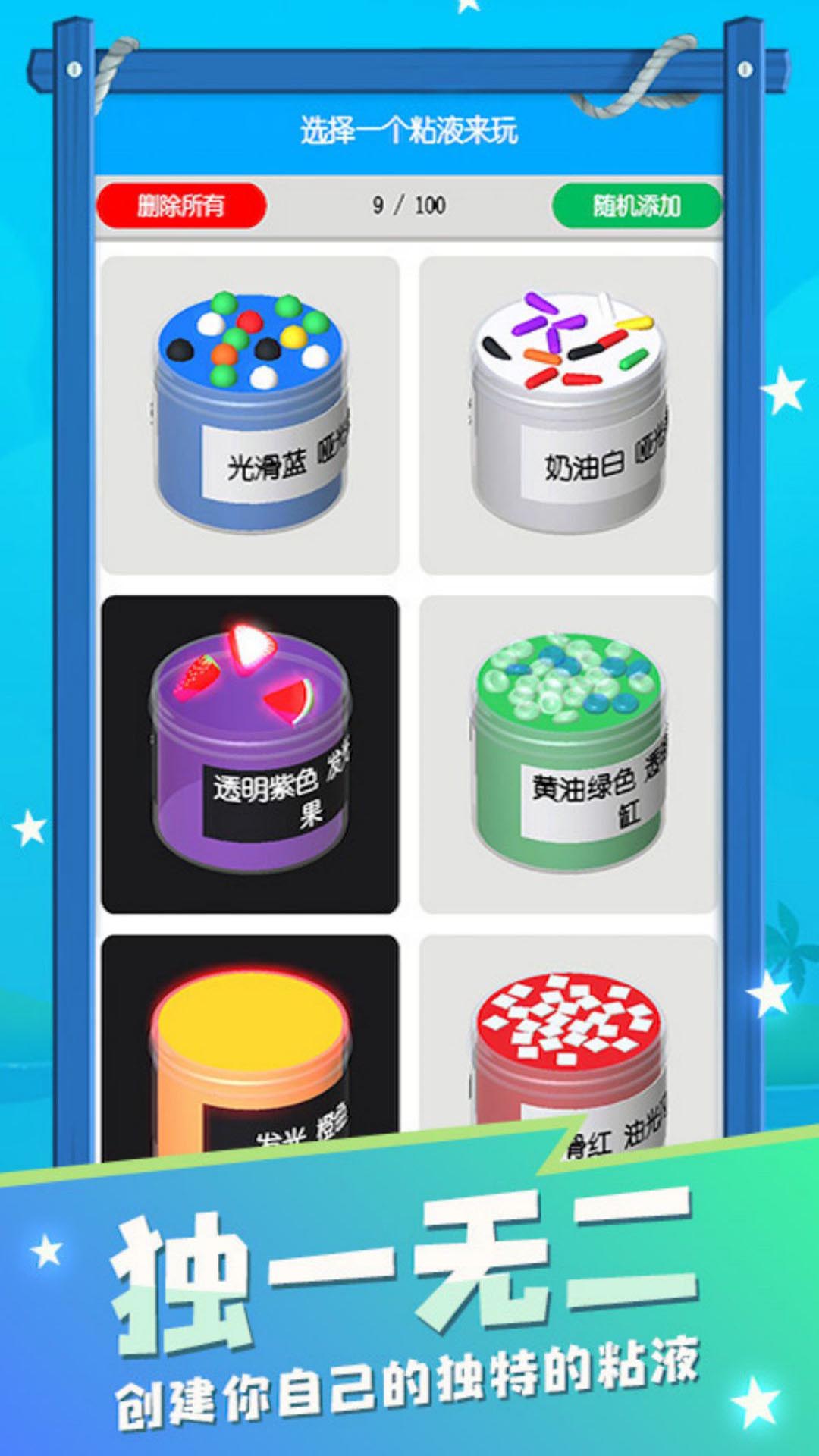 《粘液模拟器》超级史莱姆解压!<br>粘液模拟器是史莱姆制作减压起泡胶模拟粘土乐园App,制造各种奇妙有趣的解压黏液软泥用来放松自己达到减压效果!<br>想象一下手机屏幕里面藏着粘土,尝试点击黏液或者各种水晶泥,拉伸制作史莱姆起泡胶,享受各种解压音效非常奇特!这款超级仿真的粘液模拟器具有梦幻般的效果和神奇的史莱姆装扮设计元素。<br>在粘液史莱姆模拟器商店里面选择各种形态的液体球,各种颜色搭配、装饰打扮和挂件随意搭配设计,梦幻般的史莱姆粘液球简直太好玩了!<br>令人满意的减压解压放松玩具,拉动,粉碎和拉伸各种DIY粘液史莱姆,拥有一款超级解压模拟器。