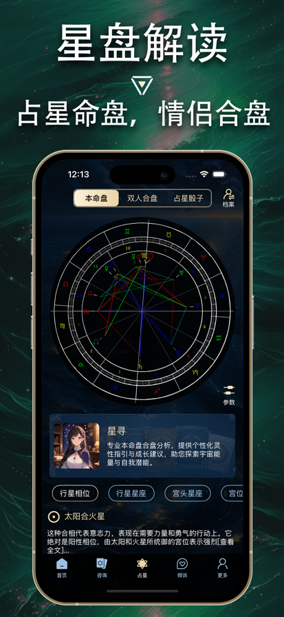 这是一款面向大众用户,同时也适用占星爱好者的专业占星应用。即使您对占星知识一无所知,我们也可以从零开始为您普及星座常识。您可以随时随地查看最准确的本命以及行运星盘图。 每个人都有一张出生图,也就是在你出生的时刻以你所在的时间空间为中心画出的天宫图,占星学称之为“星座本命盘”。正确的解读本命盘可以让你更好的了解自己,帮助你发挥自己的潜能。如果您经常听到别人讨论上升星座,月亮星座,自己却不得知,通过我们的星盘您只需不到一分钟即可查询到准确的信息和相关的解释。如果您经常关注星座运势,看到类似水星逆行,金星凌日,天冥刑的术语,却不知如何解读,通过我们的星盘您可以随意切换时间,转动星盘,同时我们也在应用内为各种术语增加了解释。 主要功能: *专业数据,精准绘制 本应用集成了世界上权威的星历表数据和先进的算法优化,您只需输入出生时间及地点,即可得到准确的星盘图。我们同时提供地图搜索功能,结合手机定位帮助您准确查找出生地点的经纬度信息 *快速存取星盘 您的所有历史星盘数据及行运时间点都可以通过保存页面进行记录,方便您随时查看切换 *方便快速的调整星盘 不论是本命盘还是行运盘,您都可以以月日时分为单位随意转动星盘以获取您想要的信息。此功能可帮助您纠正出生时间误差,查看未来天象变化。更方便您做研究比对之用 *海量信息解读 在星盘的每一个分页上的每一个名词以及占星术语上,您都可以触摸点击查看对应的解释,从行星、星座、宫位以及相位关系帮助您轻松读懂星盘 *行运预测 确定本命盘后,您可以通过行运盘的功能查看当下行星位置,结合一些权威的星座运程,您可以最大程度的了解近一段时间天象对您的影响,更好的调整自己的状态 *专业设置 您可以自定义容许度,宫位制等专业设置,普通用户可直接使用默认值 *精选运程分享 我们会不定期精选各类星座运程及天象解读,您只需打开推送通知选项便可接收更新 *星座占卜 星座占卜源自于国外流行的占星骰子。使用方法为:先在心中问一个特定的问题,然后启动占卜盘。占卜盘自左向右依次代表行星、星座和宫位。占卜开始后,各栏项目会机选择 , 最后的结果将显示在下方标签处。其中: - 行星:是此刻你所拥有的或者对你有用的基本能量类型。 - 星座:是行星的能量表现出来的方式。 - 宫位:代表受影响的生活领域。 根据以上元素的解释来解读所问问题的答案,趣味性很强,对于学习基本占星知识也很有帮助。