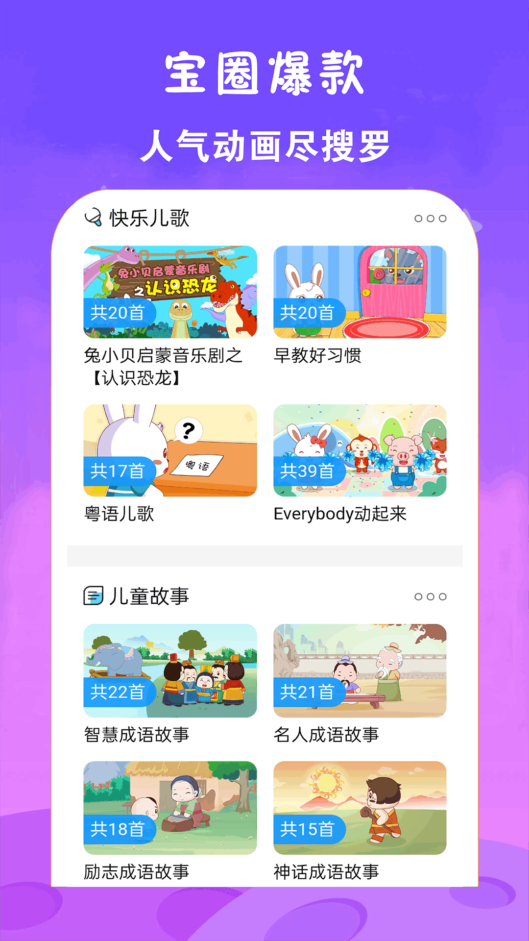 专注早教启蒙,致力于提供好听好看好玩的儿歌童话故事,精美动画,酷爽视听,真是萌萌哒! 海量儿歌、故事、国学、动画动漫内容持续更新,全方位的陪伴宝宝成长的每一天。!中英文儿歌、粤语儿歌、经典儿歌、新儿歌等视频应有尽有。,让宝宝成为有学问的人。寓教于乐的童话、益智故事,让宝宝更聪明!