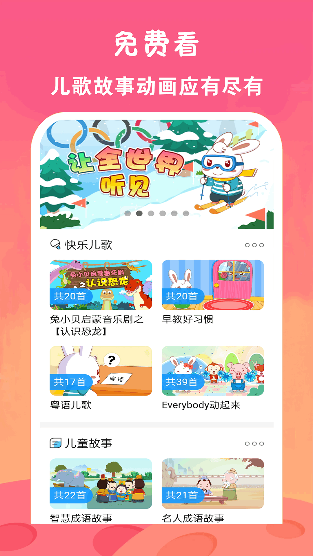 专注早教启蒙,致力于提供好听好看好玩的儿歌童话故事,精美动画,酷爽视听,真是萌萌哒! 海量儿歌、故事、英语、国学、幼儿教育视频、动画动漫内容持续更新,全方位的陪伴宝宝成长的每一天。! 中英文儿歌、粤语儿歌、经典儿歌、新儿歌等视频应有尽有。国学古诗、三字经、弟子规,让宝宝成为有学问的人。寓教于乐的童话、益智故事,让宝宝更聪明! 我们还精心收集广受中日韩欧美家庭欢迎的经典动画片,为您整理更新受欢迎的 超级飞侠、樱桃小丸子、名侦探柯南、机器猫、小猪佩奇、喜洋洋与灰太狼、小公主苏菲亚等等经典动漫, 【儿童爱听】 热门好听的儿歌童谣、哄睡音乐,还有经典有趣的睡前故事、童话故事、成语故事等丰富的有声内容。 经典儿歌:小星星、小燕子、白龙马、两只老虎、粉刷匠、刷牙歌、大风车、一分钱、我爱我的幼儿园...... 哄睡音乐:宝宝快睡吧、摇篮曲、洋娃娃的梦醒、安静纯音乐...... 快乐童谣:生日快乐、聪明的一休、虫儿飞、采蘑菇的小姑娘、小螺号、字母歌、jingle bells、if you are happy、Merry Christmas…… 经典睡前故事:白雪公主、三只小猪、灰姑娘、猪八戒吃西瓜、睡美人...... 安徒生童话:海的女儿、拇指姑娘、皇帝的新装、丑小鸭、公主与豌豆、卖火柴的小女孩...... 趣味成语故事:画龙点睛、掩耳盗铃、对牛弹琴、刻舟求剑、狐假虎威...... 贴心选择适合不同年龄段小朋友收听的内容,高清好音质更适合家长和小朋友们。 【早教启蒙】 思维、国学、科学、习惯养成、儿歌、经典唐诗、算术、认知、礼貌... 寓教于乐,潜移默化中培养儿童的知识和能力,包括创造力、记忆力、教学、逻辑推理、积极乐观和礼貌尊重等十一项核心能力。 优质的寓教于乐内容,为小朋友带来益智、健康的快乐童年。注重打造安全、单纯的观影环境,免除爸爸妈妈的后顾之忧。视频播放清晰流畅,操作界面简单友好,播放流畅并支持视频搜索等功能。 真正为小朋友和父母们带来“快乐观影”的视觉体验!让早教不再苦恼!持续定时更新视频内容,让宝宝每天看的不重样。让宝宝在轻松愉快的环境下学习语言、启迪智力、激发潜能,使宝宝在音乐的熏陶下快乐健康地成长。还有你想不到的惊喜陪伴,快来下载吧! 千万家庭早教启蒙的好选择,专属小朋友的贴身移动教育专家!一款专注儿童成长精心挑选设计的儿童启蒙应用。全部免费,内容精彩丰富,动画鲜活有趣,涵盖了动画、儿歌、故事、国学、艺术等多种内容,精挑细选, 每一部都是经典,百看不厌,让宝宝尽情享受动画时光,在快乐的氛围中慢慢成长。 【儿童爱看】 我们精心收集广受家庭欢迎的精品动画片大全、儿歌童谣大全、经典故事大全、儿童动漫大全等丰富的儿童启蒙视听内容,深受家长和小朋友们的喜爱。