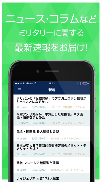 ミリタリー(軍事)に関するニュースを簡単チェック! さまざまなサイトから配信される軍事系の話題をまとめてチェックできます。 記事のお好みがあれば設定から配信元の選択もできます。 最新ニュースからコアネタまで、ミリタリーに関する情報を幅広くお届けします。