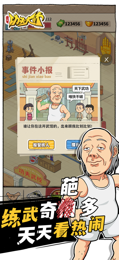 这是一款带有一些怀旧气息得模拟经营游戏。玩家将扮演一名功夫已经练到登峰造极得功夫大师,青年校长,来经营一所武术学校。 师父把经营半生的武术学校丢给你,自己出去浪了。你却在接手的第二天就重伤了上门踢馆的对手,为了赔付医药费,武校一下几乎被搬空。 你下决心好好经营,把武校打造成世界级名校。 起初武校设施简陋,人气不旺,弟子也只有大猫小猫三两只。玩家需要升级设施积攒声望,升级设施,一步步提升武校得软硬实力。 还要发掘有潜力的弟子,然后重点培养,弟子参加重要比赛并取得好成绩,才能让武校得到更高得地位。 日常还有人找上门来踢馆,由于校长功夫登峰造极,倒是不用担心输掉,只是要注意控制好力量,用力大了会重伤对手,需要赔付药费。当然也可以拒绝对方得挑战,但是避战会损失一笔声望。 特色内容: 1、大厅营业,武校的大厅是对外营业的,升级好设施就会有源源不断顾客前来消费; 2、奇葩顾客,有的顾客练武总是翻车,让人捧腹;也有的顾客天赋异禀,适合收为弟子; 3、因材施教,不同的弟子拥有不同的潜质,需要细心发掘,仔细培养 4、应对踢馆,踢馆对手会不定期上门,可以选择避战损失一些声望,也可以选择应战,应战的话就要控制好力量,对手相对校长来说是“易碎品”。