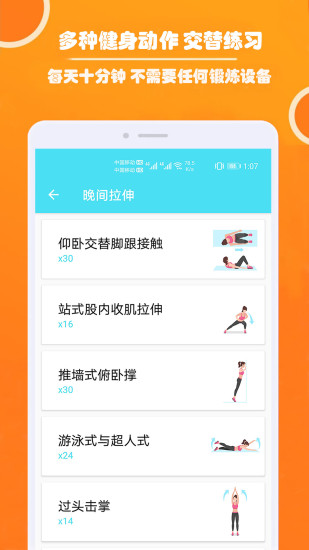家庭健身是一款适用于所有人群的居家锻炼的健身APP。无论你的目标是减肥、健身、增肌或是塑形,我们都会为你制定专属的锻炼计划,不管在家还是在健身房,随时随地都可以轻松健身!每天只需锻炼7分钟,轻松练出完美身材。 该应用程序适用于谁? 家庭健身应用适用于那些想要苗条身材并特别关注自己的健康,但没有时间在健身房定期锻炼的人。 这款家庭健身应用提供了一种简单、有效且基于科学的方法,可在 30 天内减肥。您可以随时随地进行锻炼,无需任何设备。 我们为日常锻炼制定了科学的锻炼计划,您只需每天锻炼7分钟即可达到效果! 我们的健身专家为您准备了30天的锻炼计划和饮食计划,遵循这个程序,您可以轻松地让你的身体变得更健康、更苗条。每天我们都会增加训练的负荷,让你逐步适应训练强度。 特点与优势: - 30天训练计划 我们为您制定了30天的健身计划,每天只需要花费7分钟,无需任何器械就可以让您全身都得到充分的锻炼。我们提供高质量锻炼课程,可以帮助你更好地塑形,保持健康与活力,开始新的生活方式! - 30天饮食计划 我们为您提供康个人饮食指南和菜谱,我们帮助你达到您的理想体重和健康生活的目标。所有的饮食计划都是由专业营养师设计,适用于不同人群,包括素食主义者。 - 自定义训练计划 我们提供100多种锻炼方法,您可以根据自己的需要自定义您的锻炼计划。 - 体重日记 体重日记更直观地帮助您追踪您的体重变化,来帮助您达到减肥或者增重的目的。 - 海量动作库 经过科学验证的锻炼方法可以促进减肥和改善健康。按照锻炼类别、身体部位、长度和强度进行训练,找到你喜欢的任何运动:腹肌锻炼、腿部锻炼、手臂锻炼、瑜伽拉伸等。 - 计步器 计步器可以跟踪您走路燃烧的卡路里、步行距离和时间。您可以根据自己的实际情况设置每日目标步数,结合我们的健身计划,更好更快地达到减肥健身的效果。 - 喝水提醒 我们会根据您的体重和运动时间告诉您每天需要喝多少水,同时记录你每天的饮水量,并提醒您按时饮水。 没有健身房?没有充足的时间?别担心!立即加入我们,开始为期30天的家庭健身挑战!