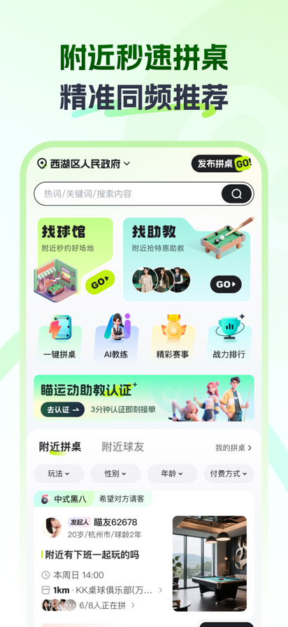 瞄运动app,你的台球娱乐好帮手,低价购券、约战、拼桌、计时记分、球杆租赁,通通搞定。丰富的技能教学和同好搭子速约,便捷的团购囤券小能手。现已覆盖同城门店超500家,附近3公里内随时随地想打就能选好地/约到人。 ※产品亮点 【附近低价团购】 ·附近5公里严选球房一键囤券,到店核销,随时可退。 ·签到即领现金,注册就送15元现金红包,支持会员优惠折扣。 【极速拼桌组局】 ·高效一键拼桌,支持玩法/性别/年龄/距离等多方位筛选。 ·球友搭子精准匹配(水平、距离、时间),线上邀约组局,线下开台。 【球友同好社区】 ·精彩击球瞬间上传分享,围观高手“名场面”。 ·附近球友动态可见,留言约战或围观学习,简单又便捷。 【球友交流社群】 ·球友杆法速览,经验水平掌握,实时发起挑战。 ·同城还有高手,切磋还是讨教,任你选择。 【品质球杆租赁】 ·严选球房绑定,随时随地享受高品质品牌球杆。 ·大小头杆免费试杆,超值会员权益,用到就是爽到。 ※产品优势 ·附近5公里严选独家合作球房,线上营销赋能,专属券价补贴,精准引流到店。 ·智能硬件加持,含智慧传感摄像头安装/共享球杆柜0成本铺设/智能球杆等权益。 ·台球垂直品类,只做球友市场,台球用户会员权益升级,台球生涯全流程记录。 【关于我们】 隐私协议:https://www.mmpp.club/h5/pages/agreement/policy 用户协议:https://www.mmpp.club/h5/pages/agreement/protocol 【联系我们】 客服专线:0571-87809300(工作日9:00-21:00) 微信客服:mmpphz666(添加时备注"瞄运动APP") 官网:https://www.mmpp.club/ © 2025 瞄瞄碰碰(杭州)数字技术有限公司 | 浙ICP备2024074170号-5A
