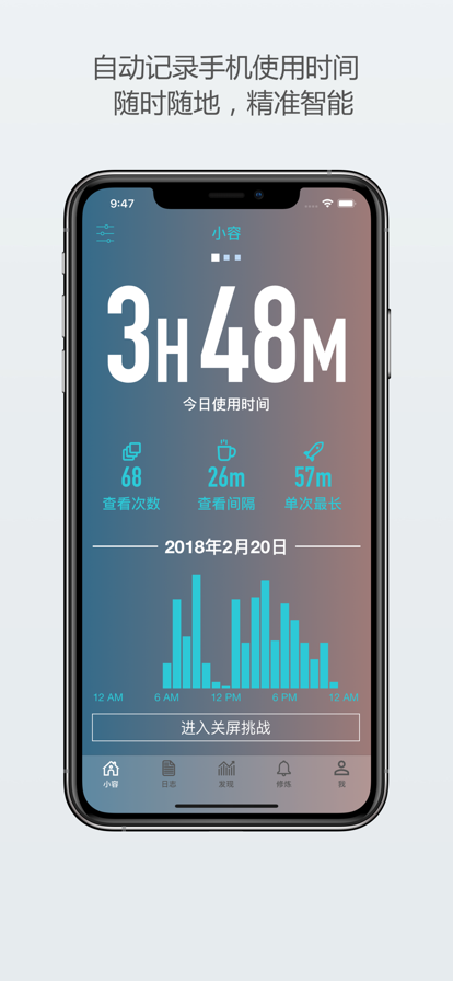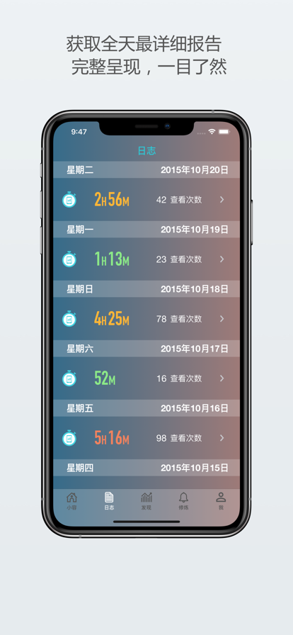 [小容] - 最智能、最准确的手机使用习惯自动记录软件 ## 全世界100多个国家和地区排名前200的效率应用 ## 载入BBC 2017年专题纪录片 “硅谷的秘密” (Secrets of Silicon Valley) ## 应用推荐第一媒体【AppSolution】重点推荐 ##【最美应用】推荐的效率类应用 (zuimeia.com) ##【极客公园】推荐 用小容,你可以[了解自己] 、[提升自己]、尝试成为[效率达人]、[和小伙伴们一起互相监督]。你若身为父母,可以使用[控管孩子]全面引导孩子的健康使用习惯 [了解自己] ◉ “首页”:我每天用了多久呢?查看了多少次?平均每多少分钟查看一次? ◉ “日志”:今天哪个时段用得最多最频繁?过度的使用手机到底让会你的每一天变的有多碎片化呢? ◉ “发现”:每天几点用得最多?每周周几用得最多?今天用量有没有比上个月的均值更少呢? [提升自己] ◉ 试试“修炼”, 设置每日使用时限,随时查看剩余额度 ◉ 对自己发起关屏挑战,接下来这一个小时不用手机了,一点开就挑战失败 [效率达人] ◉ 无限日志/高級提醒功能/只监测指定时间段/… ◉ 设定更清晰目标 (每小时查看次数,单次用时,当月累计 用时) + 激活每日用量提醒 ◉ 根据使用时长,开机次数设置强制关屏(连续弹窗提醒),保持专注 ◉ 设定禁用手机的时间段 ◉ 定时提醒使用用量 [和小伙伴一起互相监督] ◉ 我是不是手机用的太多了啊?小伙伴们,你们每天用多少呢? ◉ 邀请你们加入我的群组,我不要当最后一名 [管控孩子] ◉ 孩子玩iPhone/iPad时间太长了,为其设置每日使用时限,超过额度可开启强制停用模式,支持iPhone以及iPad版本,全面引导孩子的健康使用习惯 更多高级功能 [每周和每月使用概况] 滑动查看本周本月用量,更轻松更全面的洞察使用习惯 [无限历史记录] 解锁一周前的日志记录,对比分析历史上任意天的用量和碎片化程度 [个人数据备份和恢复] 一键备份,轻松实现云存储,一键恢复,不再担心丢失宝贵历史数据 [快捷查看方式] 通知中心添加Widget,处于锁屏状态也可一键下拉查看当天用量 [更多趋势图] 解锁本月和本年度趋势图,简洁呈现长期使用习惯 [导出个人数据] 一键导出历史记录至Excel,定制您专属的洞见 ****** 家庭群组付费订阅功能介绍 ******* 使用目的: [和小伙伴一起互相监督] [管控孩子] 功能介绍: ◉ 7*24小时记录您和家人的iPhone/iPad使用时间 ◉ 对比分析每位家庭成员每日每周每月的使用概括 ◉ 轻松设置您孩子每日的使用时间额度 ◉ 有效管控孩子继续使用iPhone和iPad的强制功能 ◉ 任意添加亲朋好友进入您的家庭群组 ------------------------------------------------- 用户好评: “The app is great for curbing my phone overuse. I love that everything is so intuitive and easy to use. Great work!” - Cynthia_326 (“这个app对我的手机控太有用了,我喜欢它的简洁和易用,太棒了!”- Cynthia_326 美国用户) “Super App!! Im Gegensatz zu anderen Apps ist es einfach in der Benutzung und übersichtlich. Das Design sieht super aus und man kann die Werte in der Wochenübersicht einsehen.” - Larissaxyz (“超级好用的app!! 很容易使用而且信息明确。设计也不错,你可以了解每周的使用概况” - Larissaxyz 德国用户) “Definitely the best usage tracker I've used and I haven't seen anything better...” - Caleb (“绝对是我用过最好的用量记录工具,没有之一” - Caleb 澳大利亚用户) “给儿子手机装了,可以知道他每天使用手机的情况” - Anna璐 中国用户 ------------------------------------------------- 如果您在使用小容时遇到任何问题,请随时通过以下方式联系我们,我们会尽力为您解决! Email:support@realizd.com *This app may use your location even when it isn't open, which can decrease device battery life.