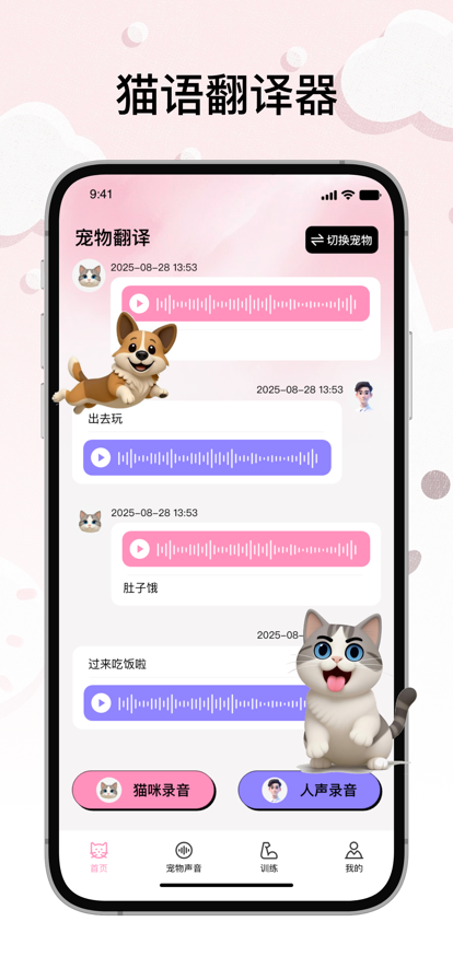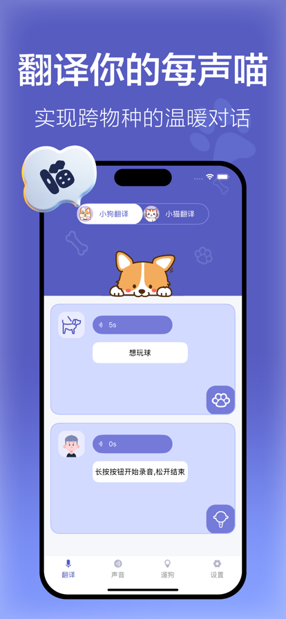 这是一个有“狗翻译”“猫翻译”功能的娱乐用趣味应用,不仅逗猫逗狗,还能结合地图定位,设计可爱,充满趣味 。 * 人猫狗互译:录制或输入你想说的话,一键转化成猫语/狗语,让宠物听懂你想说的话。 * 宠物声音库:收集海量宠物音频,供您与宠物玩耍互动,快速拉近你们的距离。 * 遛狗追踪器:记录并分析您遛狗的路线、距离、时间和宠物的行为。 是您养宠之旅中的伙伴,无论是训练、管理、玩耍,还是仅仅与您宠物之间建立联系,这款应用都为您与宠物的关系带来了新的互动层次。 === 注意 === 本应用不适用于专业训练或护理。使用它来与您的宠物开心地玩耍吧! 隐私政策:https://privacyterms.io/view/FL7JSMRU-DERH1t2c-05J07t/ 服务条款:https://privacyterms.io/view/yRSBBHhz-zPSxzZKG-DOcSmI/