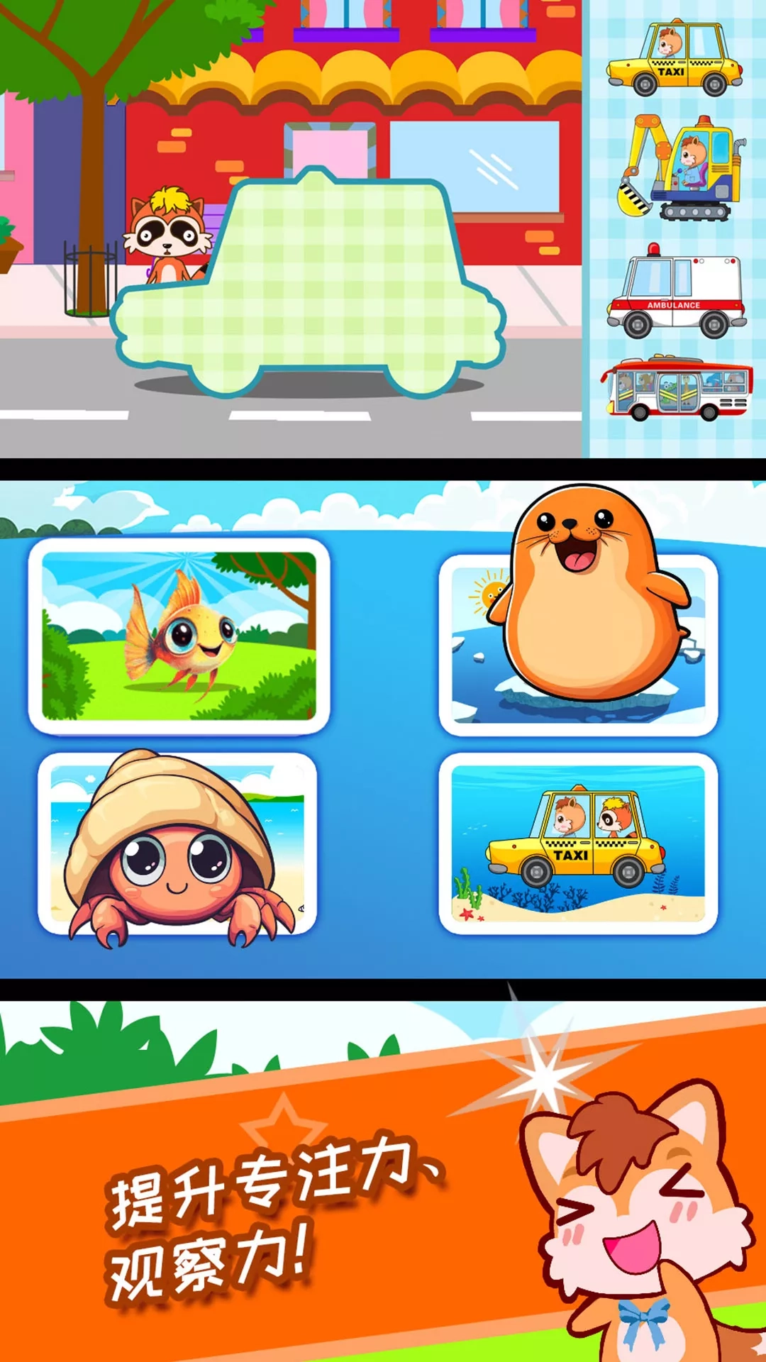 想加深宝贝对生活中小常识的认知吗?想锻炼宝贝的逻辑思维能力、推理能力、锻炼宝贝的眼力吗?想提高宝贝的洞察力吗?来探索《宝宝幼教学配对》吧 《宝宝幼教学配对》是一款为孩子们精心设计的益智APP,培养宝贝们的逻辑思维能力、推理能力、洞察力、判断能力,锻炼宝贝们的眼力,让宝贝们在生活中观察的更细致、反应更敏捷。 如何锻炼儿童观察力、思维、逻辑能力?试试《宝宝幼教学配对》吧,锻炼大脑思维。 通过帮小动物找妈妈、食物配对、汽车配对、动物生活环境配对、动物身体配对、形状配对,让宝贝们在玩中轻松掌握各种日常小常识,提升宝贝们的观察力、思维、逻辑能力。