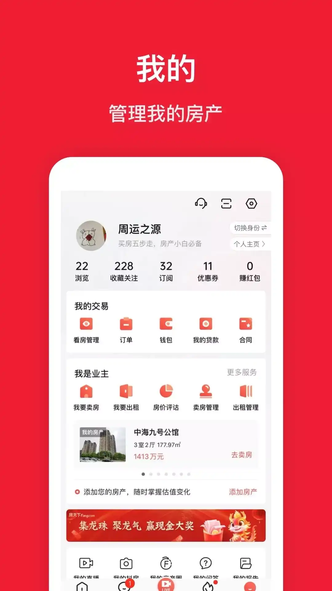 一款网罗新房二手房租房装修的专业房产软件。 *超过2亿买房装修用户选择下载并使用房天下APP ,遍布全国600多个城市 *卖房专家:600多万业主选择委托房天下卖房 *数据库:超30万个新房和二手房楼盘、超300万套房源、超200万张装修效果图 *在线服务:350万二手房经纪人、13万新房置业顾问、90万装修设计师在线为买房用户和装修用户服务 *新房:实时更新新楼盘;二手房:精准筛选真房源;查房价:随时随地查房价 *装修:特价家具建材0元抢,家装设计免费拿 核心功能: 【找房更方便 多维度精准楼盘搜索】 精准搜索:支持区域、价格、类型、户型等多维度搜索和综合搜索 地图找房:精准定位附近找房,折扣房、地铁房、商业地产、周边学校一键搞定 随手查房价:实景扫一扫,即刻获悉楼盘房价及相关信息 帮你找房:专属顾问随时在线、全程陪伴、保障质量 新房看房团:私人定制看房路线,直达售楼处 【大数据运算 装修用户需求精准匹配】 百万图片:支持价格、风格、小区精准搜索,设计搭配免费参考 免费服务:免费验房、量房、设计、智能报价、DIY设计 对于产品有任何疑问或建议,添加微信fang_yhty