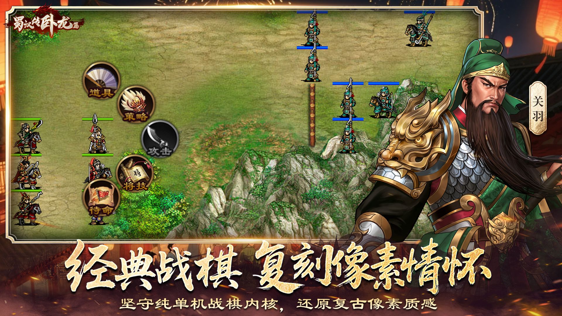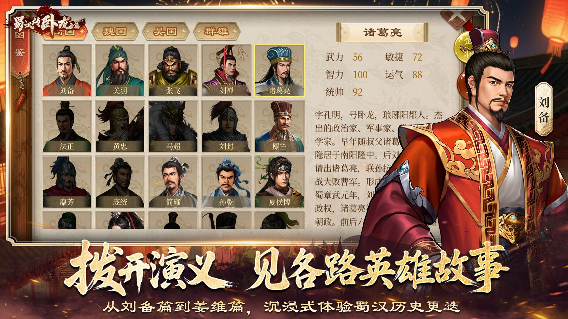 《蜀汉传卧龙篇》是一款以三国历史为背景的剧情向策略战棋游手游。游戏主线剧情分为上下两篇,其中《刘备篇》主要讲述刘备在诸葛亮、关羽、张飞等人的辅佐下,平讨黄巾,与天下群雄逐鹿中原,最终改元称帝,与魏、吴两国三分天下的故事;《卧龙篇》则主要描述了蜀汉昭烈帝刘备去世后,丞相诸葛亮继承遗志,南征北伐,以一己之力保全蜀汉的故事。在游戏中,你几乎可以体验到以蜀汉为视野的全部三国内容。 战役关卡 《蜀汉传卧龙篇》的主线关卡共150关,每个关卡的设计和玩法都不相同,所有历史上的著名战役在游戏中都有得到还原,虎牢关三英战吕布挑战三国最强武将,赤壁大火烧尽曹军百万战船,夷陵七百里连营竟被付之一炬……后续还有更多的名将列传关卡也正在筹备中,将会陆续跟大家见面。 历史文化 除了正常的关卡挑战和剧情欣赏之外,我们还推出了历史文化类版块《黄锺瓦缶》,版块内除了有玩家熟悉的宝物图鉴之外,还将加入人物图鉴、音乐欣赏、游戏词典解析等文化类内容。玩家可以通过这个版块,了解与游戏有关的人物列传、道具说明、名词解析,从而获得各类相关的历史知识。