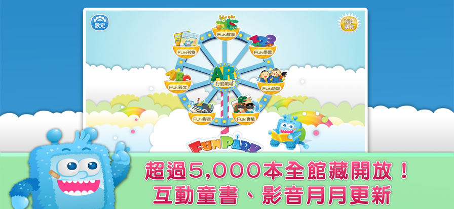 FunPark童書夢工廠-童書繪本與育兒教育精選 App FunPark提供每月超過5,000本的互動電子童書與兒童影音,它能讓孩子隨時隨地盡情的讀故事、說故事、玩故事、學習知識,讓孩子在遊戲探索間,加強八大智能,建構5Q成長,成就孩子一生的閱讀力。 *IDEAS Show「評審獎」、「最佳行動服務獎」雙料大獎肯定。 *專為3-12歲小朋友量身設計,透過互動操作方式,讓孩子愛上閱讀。 *專業幼教團隊推薦每月學習計劃,橫跨八大主題館,提供多元學習內容。 *集結知名童書出版社、全球超過200,000名家長感動推薦。 *支援iOS 11.0以上之手機與平板、使用HDMI轉接輕鬆銜接電腦、電視,離線閱讀更方便。 *打造孩子的智能5Q,建構智慧力IQ、創造力CQ、品格力MQ、情緒力EQ、領導力LQ、全面激發孩子全腦潛能。 【FunPark主要特色】 ●【八大主題館,童書、動畫月月更新】 集結知名童書出版社,嚴選幼教內容,每月推薦5,000本暢銷繪本與優質動畫,並月月童書與影音內容,從故事、語文、數學、自然科學,甚至是品格教育,包含多圖瀏覽與遊戲創造,讓孩子永遠能有不同的新體驗,培養對閱讀學習的興趣。 ●【直覺互動介面,啟發閱讀力】 有別於傳統教材,所有內容皆透過互動的直覺操作方式,結合遊戲與創造單元,讓孩子可以在充滿自由度的介面之下,輕鬆地學習,建立對閱讀及學習的熱忱,最後再透過創造及想像,讓孩子在遊戲探索間,成就孩子的多元智能發展。 ●【分齡與分類,建構5Q成長】 專業幼教團隊針對學齡前(3~6歲)、7~8歲、9~10歲三個階段量身打造每月學習計畫,為不同年齡層的小朋友推薦適合的書籍,經由閱讀,加強八大智能,建構5Q成長。 ●【跨多元載具,增加學習樂趣】 一組帳號可通行於三台平板、支援iOS 11.0以上之手機與平板,更能透過Air Play輕鬆銜接大螢幕電腦、電視,完全不需額外付費。 ●【輕鬆離線閱讀,隨時貼心陪伴】 支援離線閱讀,可隨時隨地閱讀已下載的內容,讓孩子自由翱翔於童書夢工廠。 歡迎關注Facebook粉絲專頁:https://www.facebook.com/funpark.tw 【客服中心】 任何使用上的問題,歡迎來信service@smartfun.com.tw,會有專人為你服務解答,謝謝!
