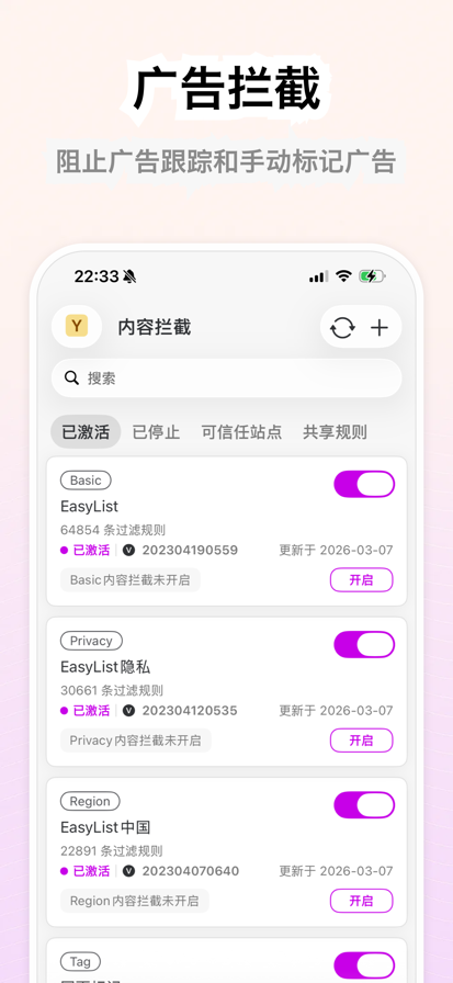 拦截365是一款Safari浏览器增强工具, 不仅可以拦截网页中的各种牛皮癣广告,还可以拦截恶意跳转,持续保护您的隐私安全,给您一个绿色、安全、便捷的网页浏览环境,给你一个【干净】的浏览体验 ***功能介绍*** 1、自动拦截网页跳转 当浏览网页时,经常会自动跳转到网页对应的APP,开启该功能后,可以自动拦截网页跳转到APP。 2、自动去除网页横幅广告 当浏览网页时,经常会有各种横幅广告,开启该功能后,可以自动去除网页上的横幅广告。 3、标记去广告 当浏览网页时,经常会有多种多样的广告,开启该功能后,可以手动标记并去除任何网站的任何广告。 4、自动展开全文 当浏览网页时,经常需要手动展开更多,开启该功能后,可以自动展开全部内容。 5、更多功能在路上... ***我们的优势*** 1、拦截规则每天即使更新,适配绝大多数常用网站。 2、所有数据本地直连,浏览速度更快,更安全快捷。 3、阻止网页获取您的个人隐私信息,内置网络分析过滤器,全方位保护您的隐私安全。 4、支持自定义标记广告,完美去除牛皮癣广告。
