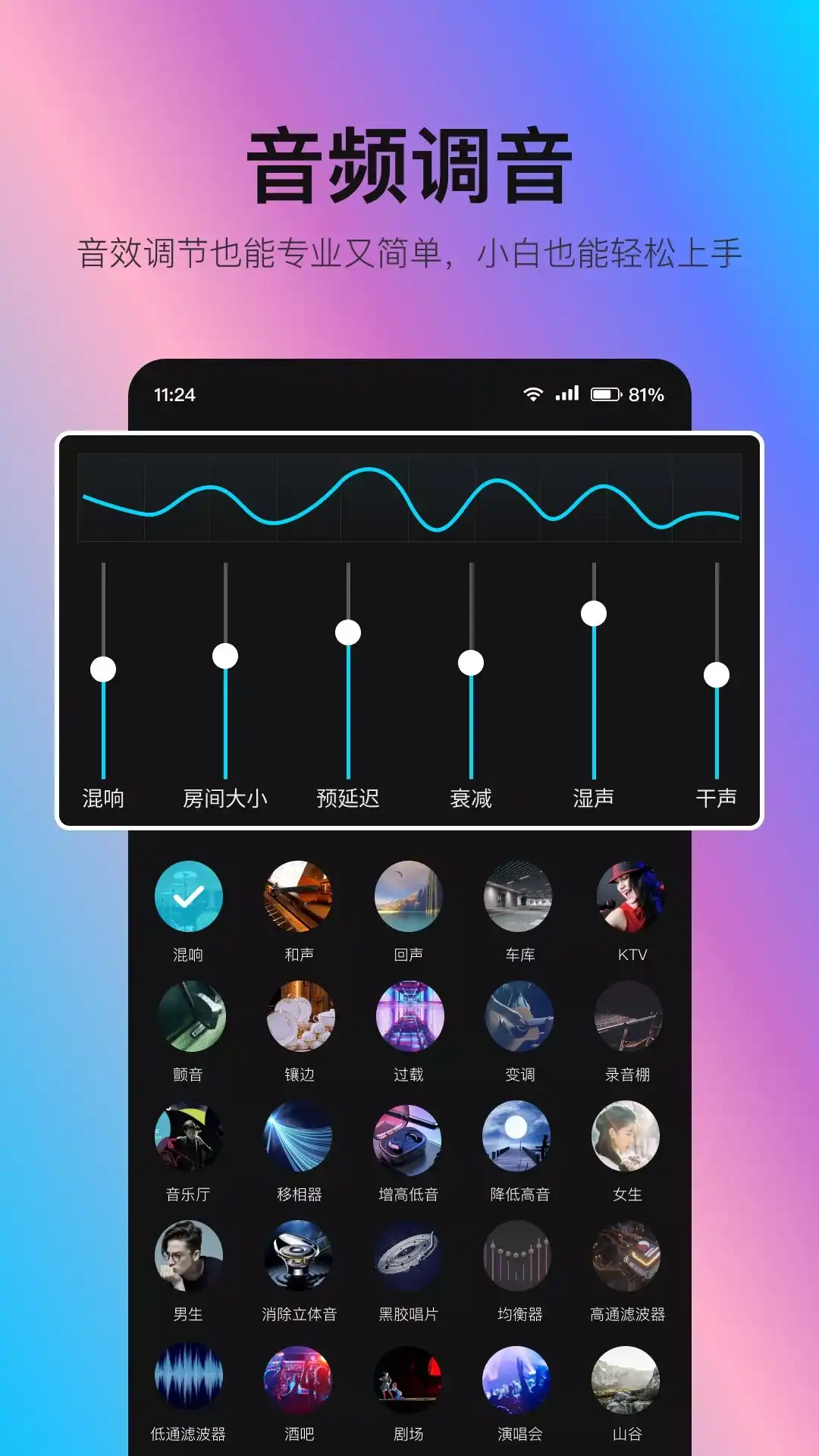 音频剪辑、降噪、提取伴奏、人声分离、混响、和声音效、视频转音频、混音、拼接、均衡器、歌曲合成、音速音量调整、格式转换、升降调、多轨编辑、压缩、等音频修饰的应用。 英文名:AudioPretty 主要功能: 【多轨编辑】:多个音轨同时编辑对齐分割调整加音效,超强混音 【歌曲合成】:不同音频混合在一起,比如自己声音和伴奏合成或声音添加背景音乐(混合对齐可精准到0.001秒) 【音乐剪辑】:剪辑或删除音频的其中一部分 【音效调音】:为音频加音效,如:和声/混响/高低音/黑胶唱片/音乐厅/录音棚等 【AI取伴奏】:完美提取音乐伴奏 【AI取人声】:完美提取音乐人声 【音频拼接】:不同音频拼接在一起成为一个连续的音频 【自然音效】:上万种音效免费下载,如:鸟叫/猫叫/流水/昆虫/乐器/铃声/游戏音等 【录音】:高清音质录音更清晰小巧(能实时听录音耳返) 【格式转换】:全能音频格式转换器 【降噪】:消除音频中类似于嘶嘶、嗡嗡的声音或白噪音,让音频更清晰(100个降噪级别,五种降噪算法远超大厂降噪效果) 【视频】:视频取音频、视频转音频、音视频合并、视频消音、视频压缩、视频格式转换、视频取伴奏、视频取人声、视频剪辑、视频转GIF 【左右耳音】:戴上耳机听音乐时,左右耳机播放不同歌曲 【边听变录】:播放歌曲,同时录制自己声音。可在音频任意位置添加合成录音,Enjoy唱歌的乐趣,比K歌软件更灵活更好用。 【MIDI五线谱】:MIDI显示为五线谱可保存为图片,能播放不同乐器 【升降调】:升高或降低音频音高 【淡入淡出】:对音频的开头、结尾应用淡入淡出效果(五种算法) 【歌曲封面】:为音频添加自定义封面图片等信息 【EQ均衡器】:调节均衡器效果,高通和低通滤波器效果,可以改Q值和加3D。预设多种音效(舞曲/流行/蓝调/人声/低音几十种) 【插入音频】:在音频任意位置连续不断的插入多段音频 【音频分割】:将音频随意分割成多段分别保存 【歌词播放】:播放歌曲显示歌词,方便歌词的编辑和调整 【音视频压缩】:音视频体积压缩的更小,想压多少就多少 【文字转语音】:文字转换为语音保存 【音频转文字】:音频转换为文字保存,准确率高达90%以上 【音乐五线谱】:音频文件显示为五线谱 【音量音速】:音量音速调整,支持局部调整 更多功能无法表达,赶紧去下载吧~