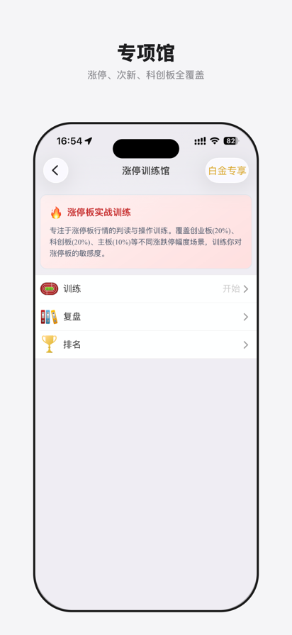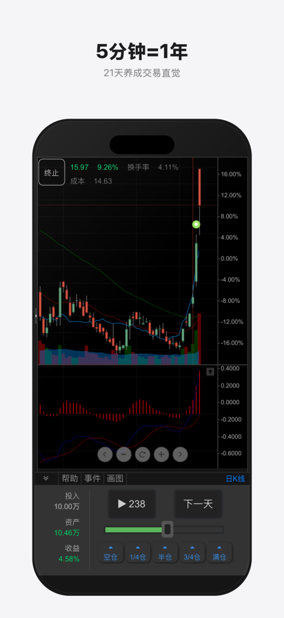 大操盘手 —— 专业操盘手必备的双盲训练神器,21天建立你的职业交易系统! 大操盘手 4.0 全面升级,在保留经典的"双盲训练"基础上,新增针对沪深市场高波动的专项训练馆。通过海量历史行情,助你快速积累万倍盘感。 【新增专项训练馆,直击实战痛点】 - 涨停板训练馆:复刻沪深市场所有涨停板行情,深度拆解封板逻辑,锤炼超短线嗅觉。 - 次新股训练馆:专注新股上市后的波动规律,捕捉高胜率的开板机会与趋势拐点。 - 科创板训练馆:适配 20% 涨跌幅限制,习惯高波动节奏,训练在极端行情下的冷静心态。 - 股指期货训练馆:主力合约高频 K 线,建立对宏观波动与杠杆交易的深度认知。 【为什么选择大操盘手?】 - 独创双盲模式:屏蔽股票代码与时间,让你只关注价格行为,摒弃主观偏见。 - 5分钟=1年经验:在浓缩的历史行情中快速建立肌肉记忆。 - PVP 全球竞技场:实时真人对战,切磋交易逻辑。 - AI 生态集成:通过与 TradeGym 深度联动,一键开启 AI 深度复盘与逻辑诊断(部分功能需跳转至 TradeGym 体验)。