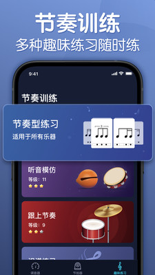 专为爱玩乐器节奏的你准备的专业节拍器&调音器,它不仅能帮助你掌握日常的乐器音乐节拍,亦可作为乐器高阶节奏训练的必备工具,节拍器让节奏律动掌握如此方便简单,随时随地,妙不可言,让你从此爱玩钢琴吉他尤克里里等乐器节奏。 【特色功能】 - 支持多种不同的音色; - 多种不同节奏供选择; - 调节各种节奏的速率直至调出所需音乐节拍; - 保存常用的音乐节拍,在我的列表一键播放,方便又快捷; - 节奏游戏,不仅可以帮助熟悉音符,还能在游戏中理解记忆节奏; - 你值得拥有的手机节拍器,按钮点一点,操作方便快捷; - 简单精美而又充满人性化的操作界面; - 更多的功能期待您的亲自体验。 节拍器为每一位音乐爱好者而生,助您掌握专业节奏律动!无论您是已经得道的大神还是初出茅庐的菜鸟,它都将是您值得拥有的节奏工具。