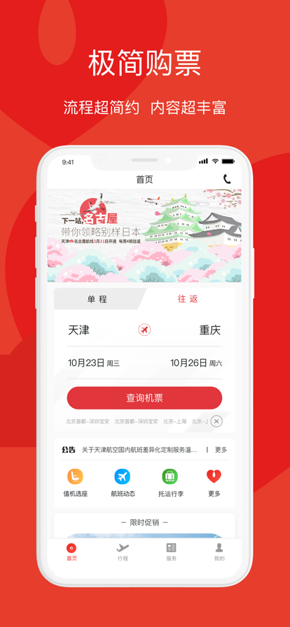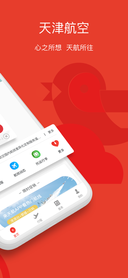 心之所想,天航所往。海航旗下天津航空,您身边的航空公司。 下载海航旗下天津航空APP,预订特价机票、托运行李及机上餐食! 【天津航空】 天津航空于2009 年6 月8 日成立,天津航空拥有在册飞机105架;在天津、西安、呼和浩特、乌鲁木齐、贵阳、重庆等9个城市拥有基地;开通国内国际航线261条,通航城市134座;连续安全运营12年,安全飞行超225万小时。天津航空聚焦旅客出行体验,创新性推出多样消费者需求组合,提供个性化、差异化、定制化精品服务,满足旅客多元出行需求,致力于打造具有全球影响力的精品差异化服务航空品牌。 【服务说明】 天津航空APP为您提供简单快捷的机票预订服务,包括:机票预订、航班动态查询、购买增值服务、在线值机、在线选座、航班退票、备降证明等;天津航空APP购票更低价、预订更省心! 【功能简介】 机票预订:首页直接搜索国内及国际百余条航线,预订机票,让您轻松成行。 增值服务:买行李、订餐食,一键购买。 在线退票:行程有变不用担心,APP在线退票帮您分忧。 在线值机:免除机场值机柜台排队,快捷出行,根据自己的喜好自助选择座位,足不出户即可确认航班信息。 订单管理:APP在手,所有行程尽在掌握。 航班动态:查询航班起飞时间和延误状态, 随时掌握航班实时动态,方便安排您的旅程。 【热门城市】 国内:天津、西安、呼和浩特、乌鲁木齐、贵阳、重庆、大连、海口、三亚、郑州、上海、成都、深圳、厦门、杭州、武汉、昆明、桂林、榆林、珠海、揭阳、长沙、温州、湛江、南京、丽江、广州、宁波、烟台、济南 天津航空官方网站:https://www.tianjin-air.com/ 24小时客户服务热线:95350
