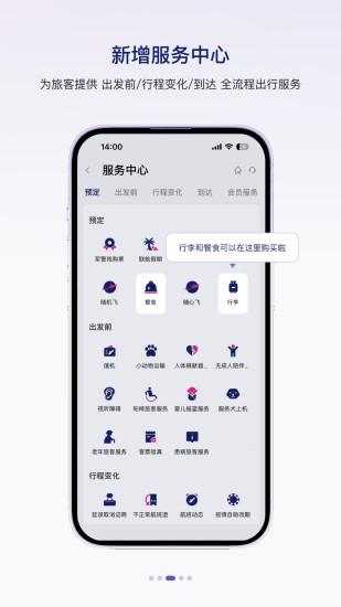 用户可以通过南航移动客户端或关注南航官方微信公众号,在手机上轻松办理出行全流程的航空服务或便捷购买旅行产品。其主要功能从出行规划覆盖至飞行结束,具体如下:出行前提供机票预订、旅游度假、提前选座、餐食预订等服务,手机一键预订,行程安排无忧;飞行前提供航班动态查询、办登机牌、机场接送等服务,轻松抵达机场,乘机办理无忧;在机场可使用航班退改、手机登机、行李购买、付费休息室等服务,避开拥挤人群,机场服务无忧;飞行途中提供机上娱乐、机上购物、机上WIFI、机上升舱等特色服务,机上随心享用,飞行体验无忧;到达目的地后可预约接机服务、查询当地玩乐信息、游玩攻略等,购买城市通票,当地玩乐无忧;出行后可累积里程、在线下载报销凭证、航延证明等,后续服务无忧。南航APP集旅行预订、出行服务、出行帮助于一体,满足用户出行全流程需求,贴心好用!